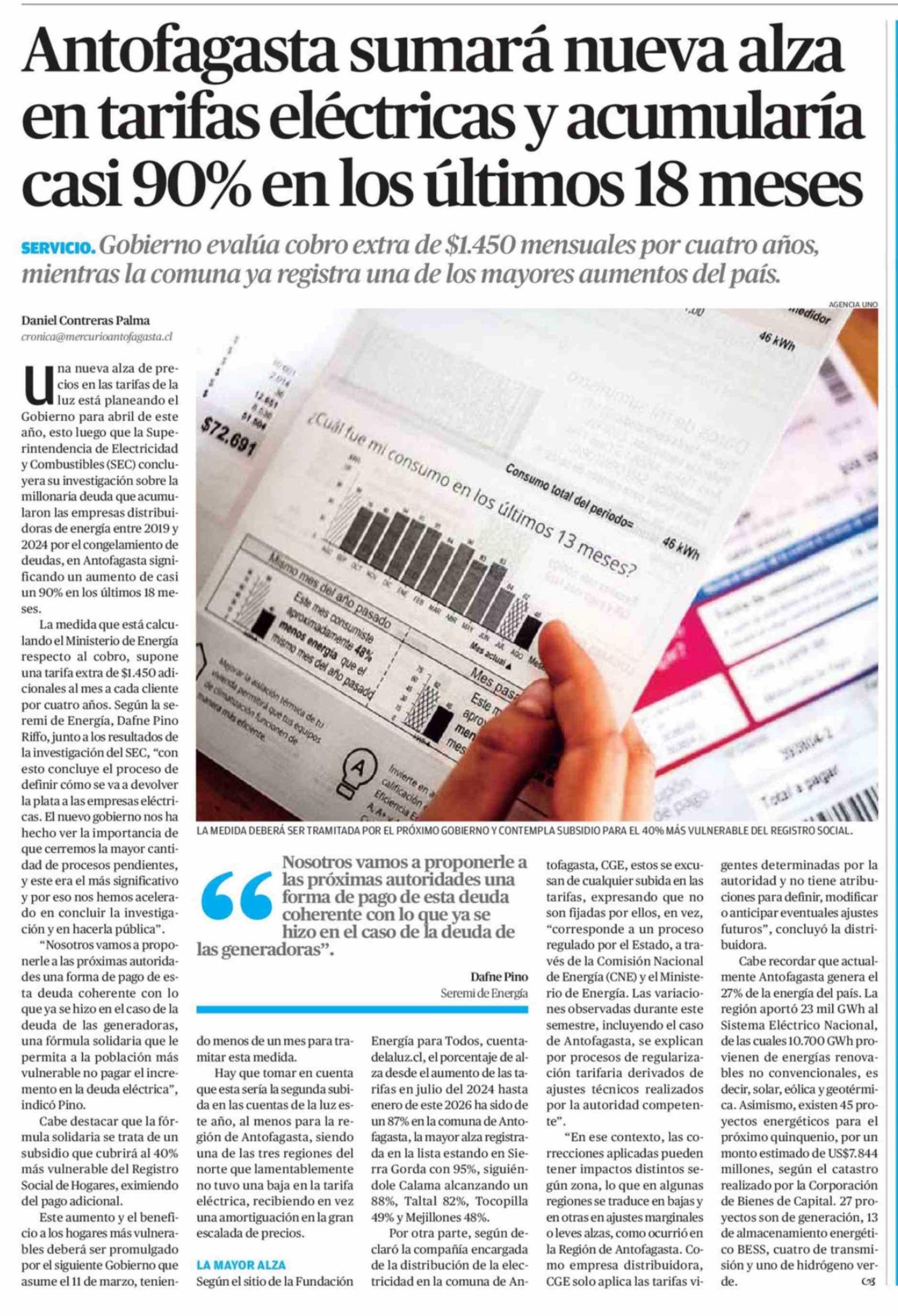 Antofagasta sumará nueva alza en tarifas eléctricas y acumularía casi 90% en los últimos 18 meses