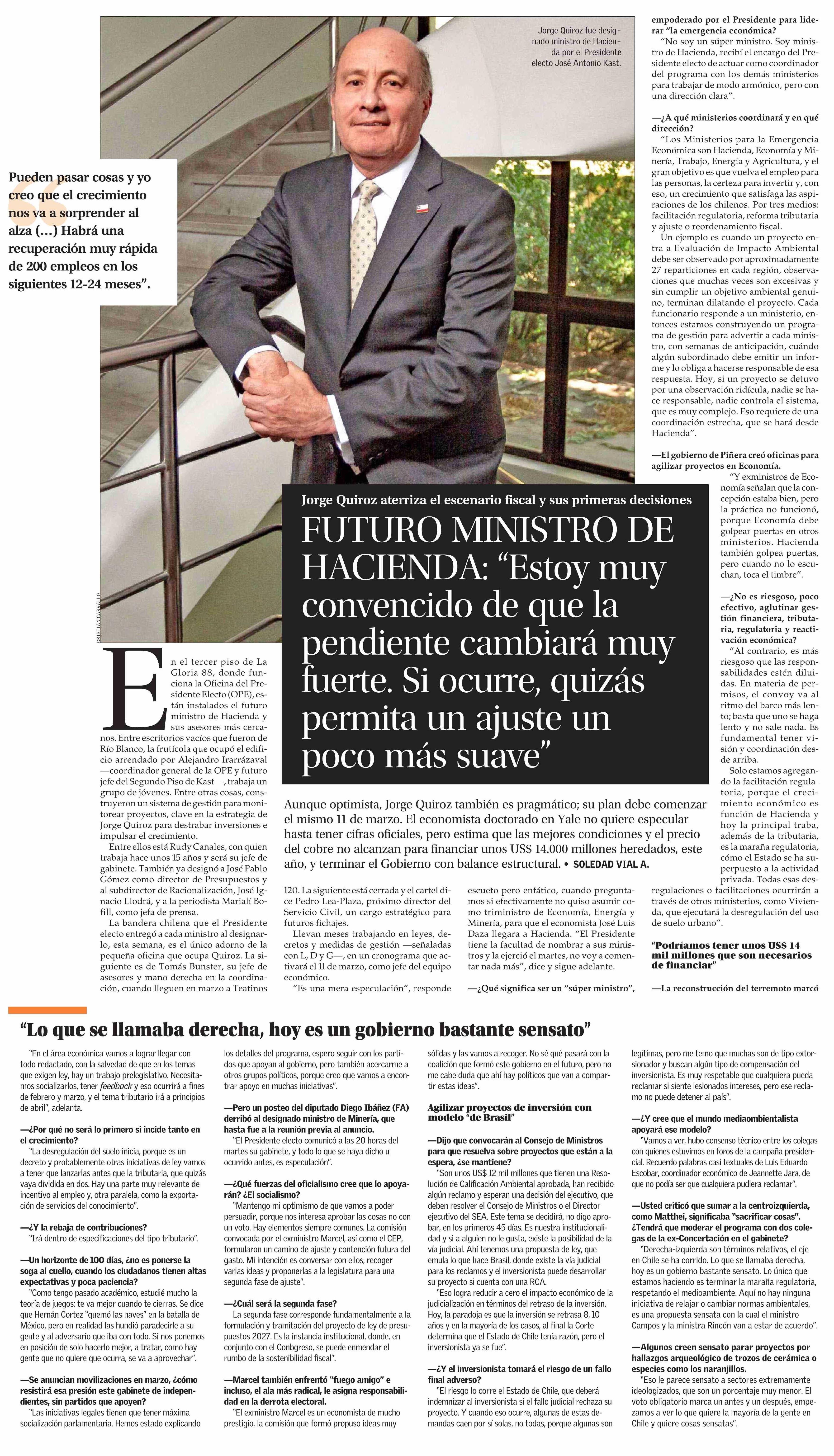 | Título: | FUTURO MINISTRO DE HACIENDA: “Estoy muy convencido de que la pendiente cambiará muy fuerte. Si ocurre, quizás permita un ajuste un poco más suave” |