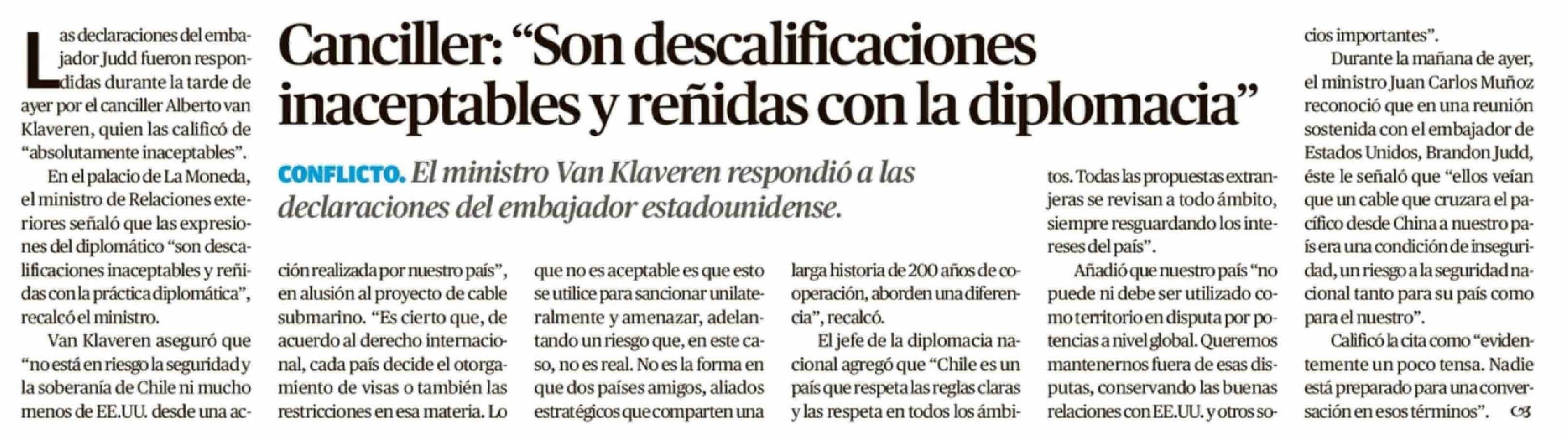 Canciller: "Son descalificaciones inaceptables y reñidas con la diplomacia"