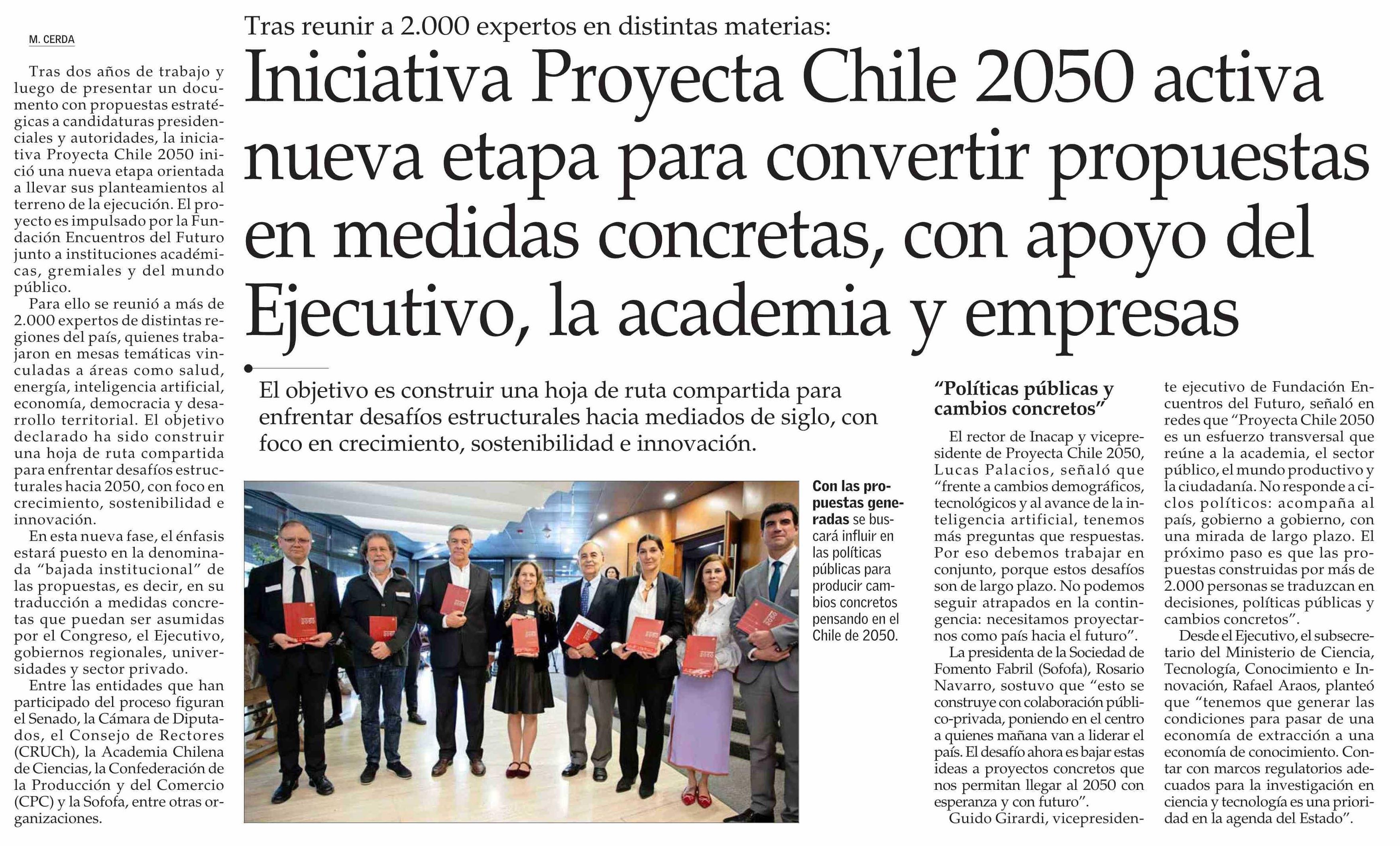 | Título: | Iniciativa Proyecta Chile 2050 activa nueva etapa para convertir propuestas en medidas concretas, con apoyo del Ejecutivo, la academia y empresas |
