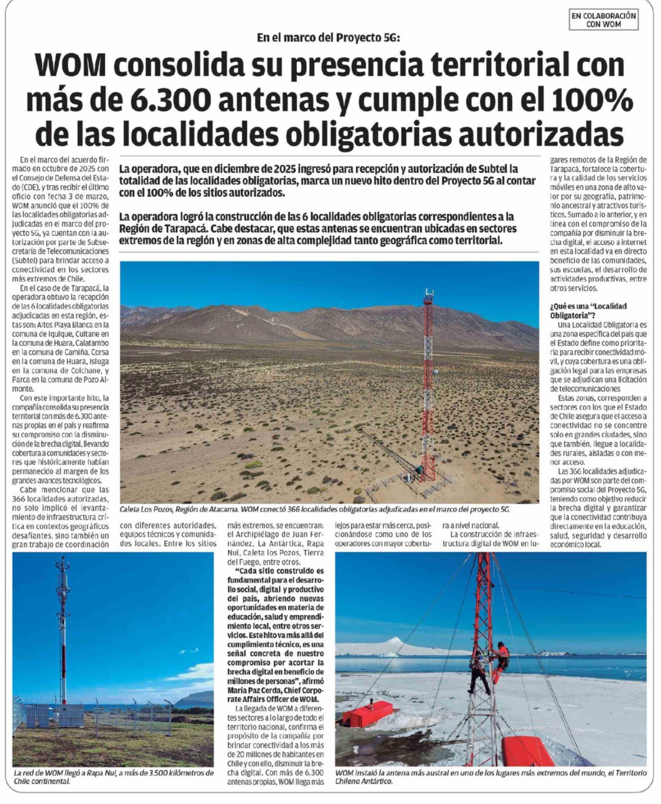 WOM consolida su presencia territorial con más de 6.300 antenas y cumple con el 100% de las localidades obligatorias autorizadas