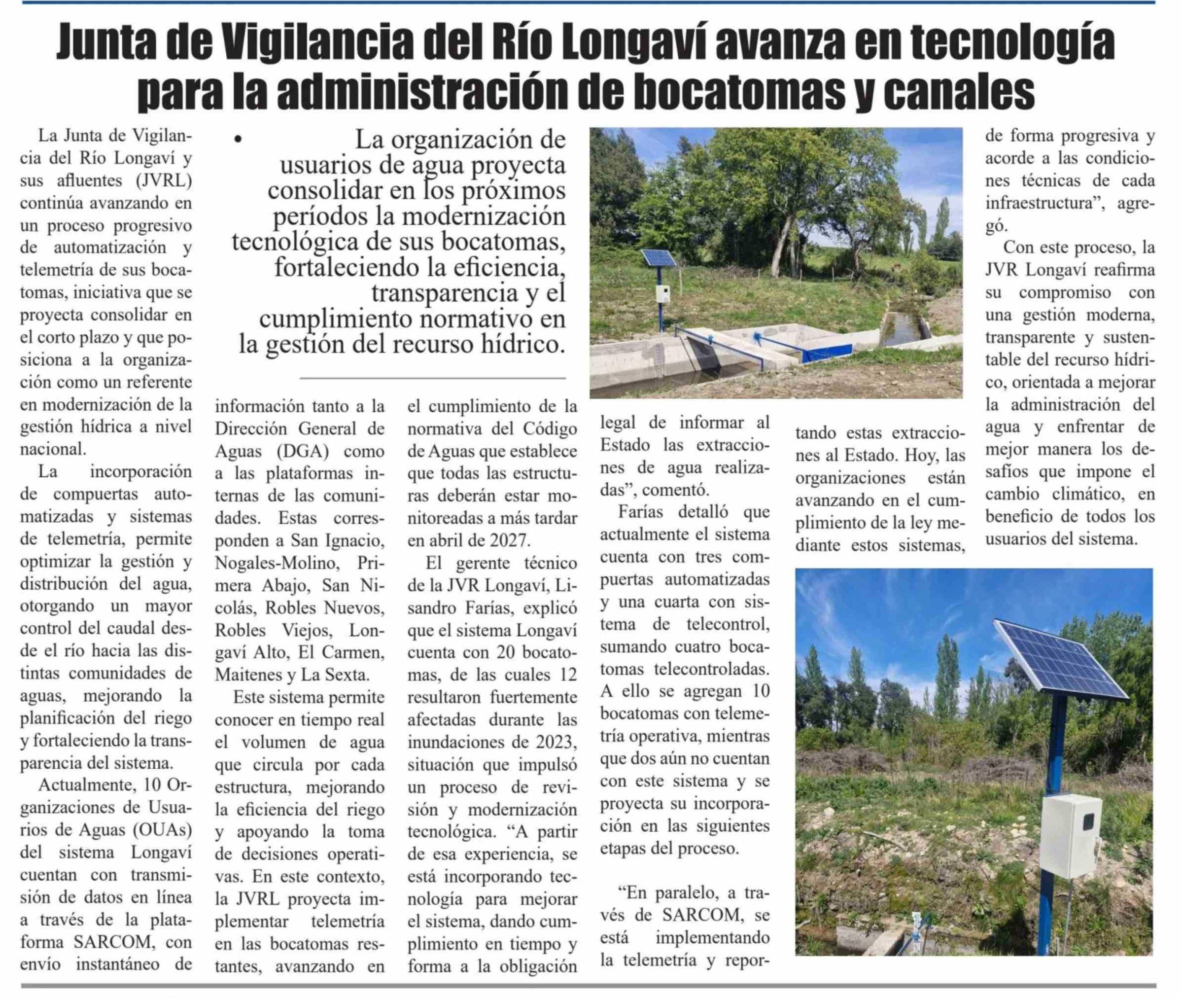 Junta de Vigilancia del Río Longaví avanza en tecnología para la administración de bocatomas y canales