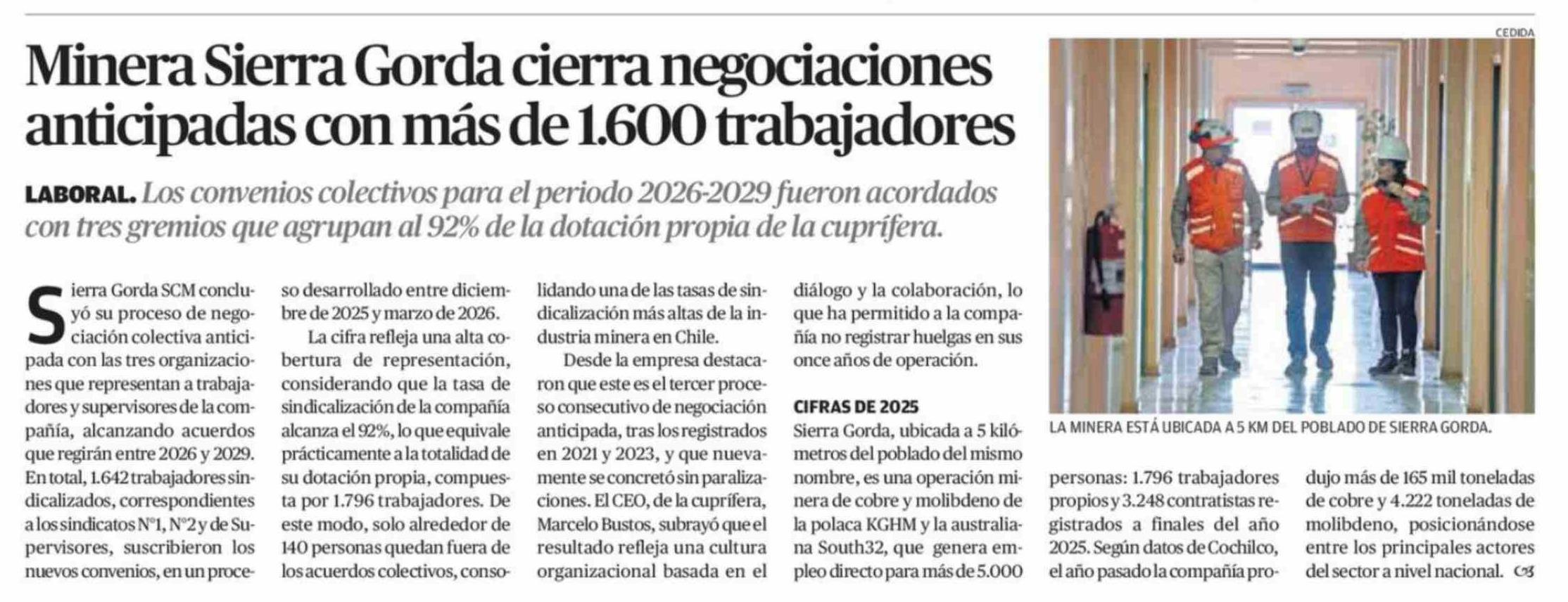Minera Sierra Gorda cierra negociaciones anticipadas con más de 1.600 trabajadores