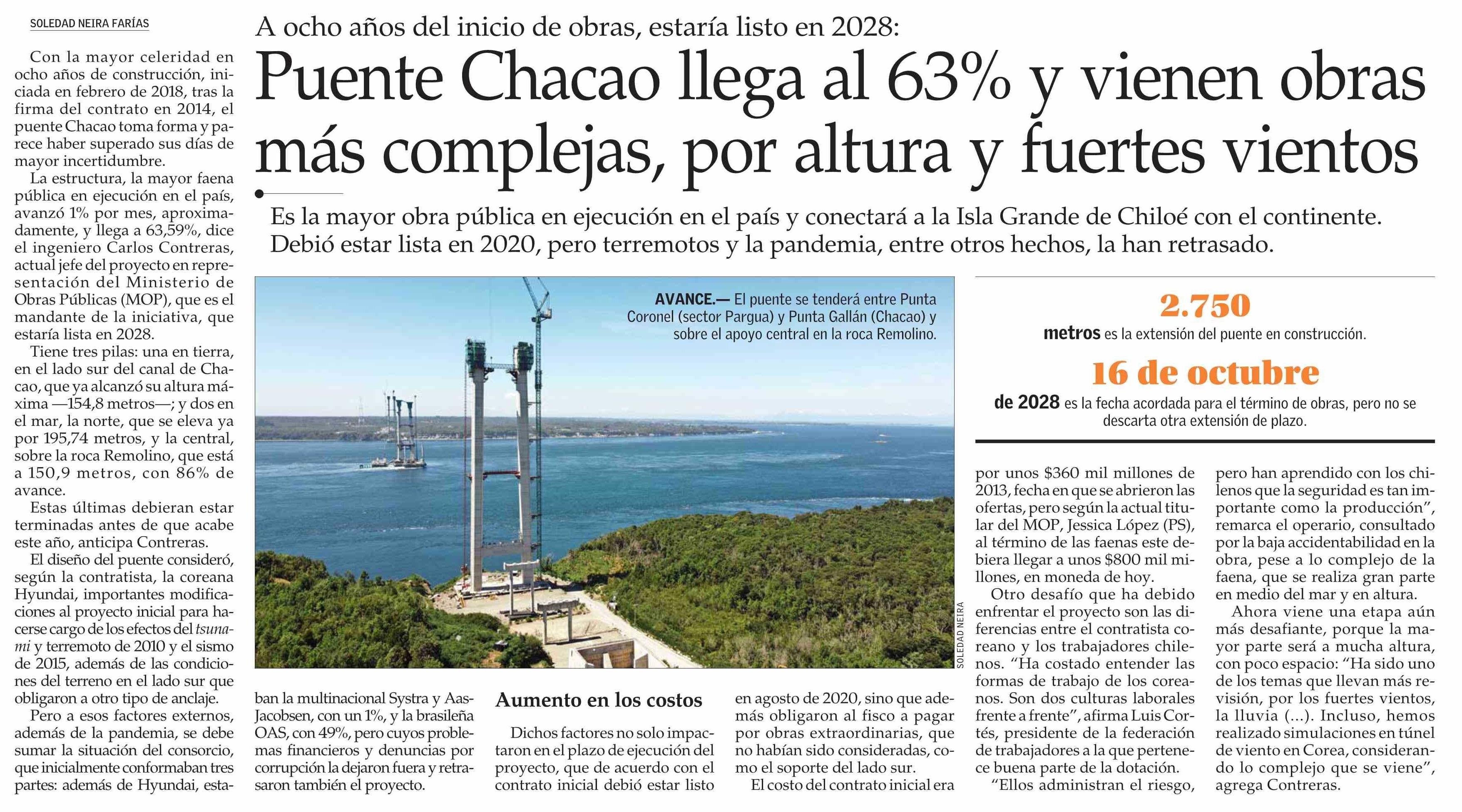 Puente Chacao llega al 63% y vienen obras más complejas, por altura y fuertes vientos