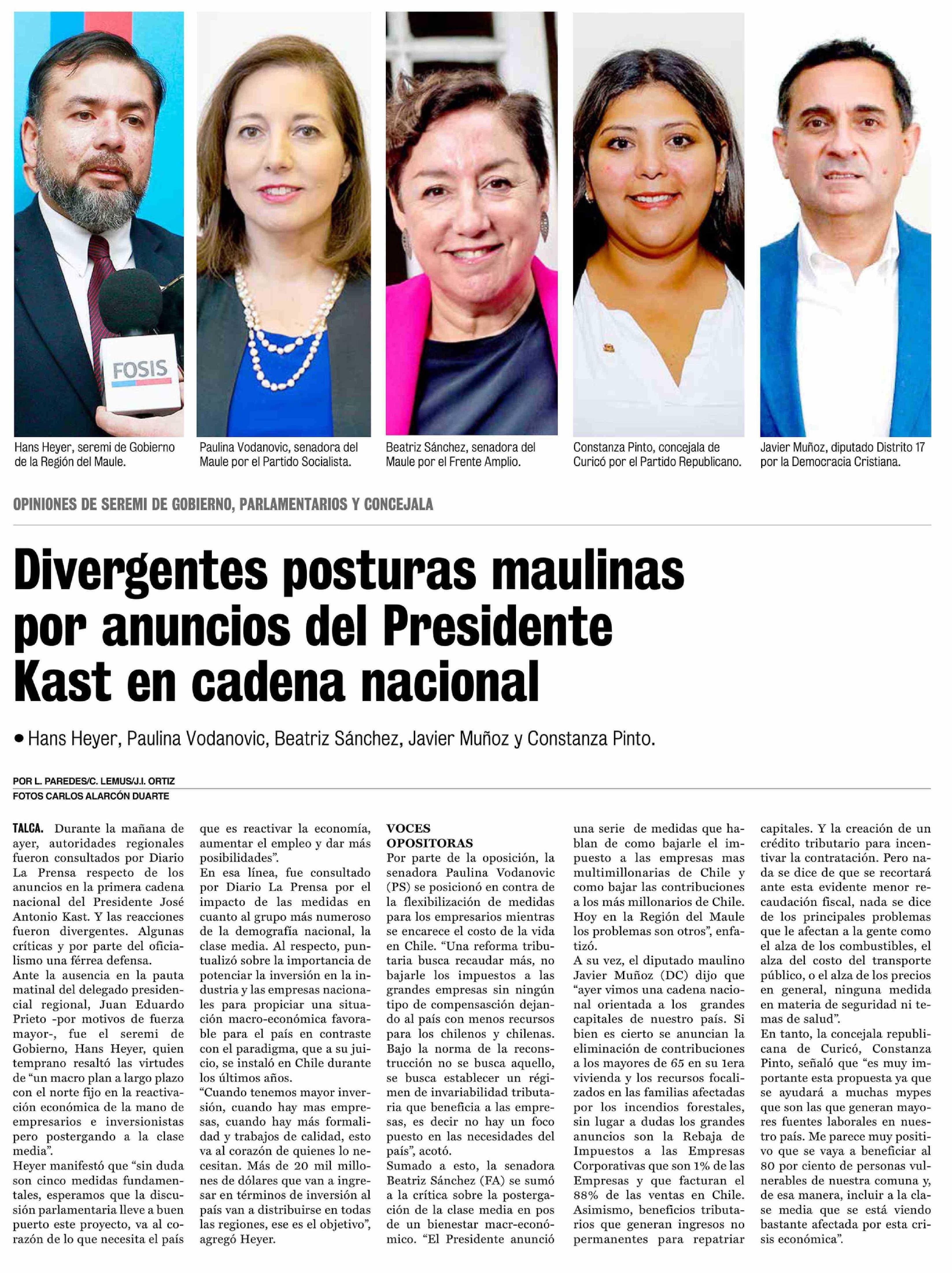 Divergentes posturas maulinas por anuncios del Presidente Kast en cadena nacional