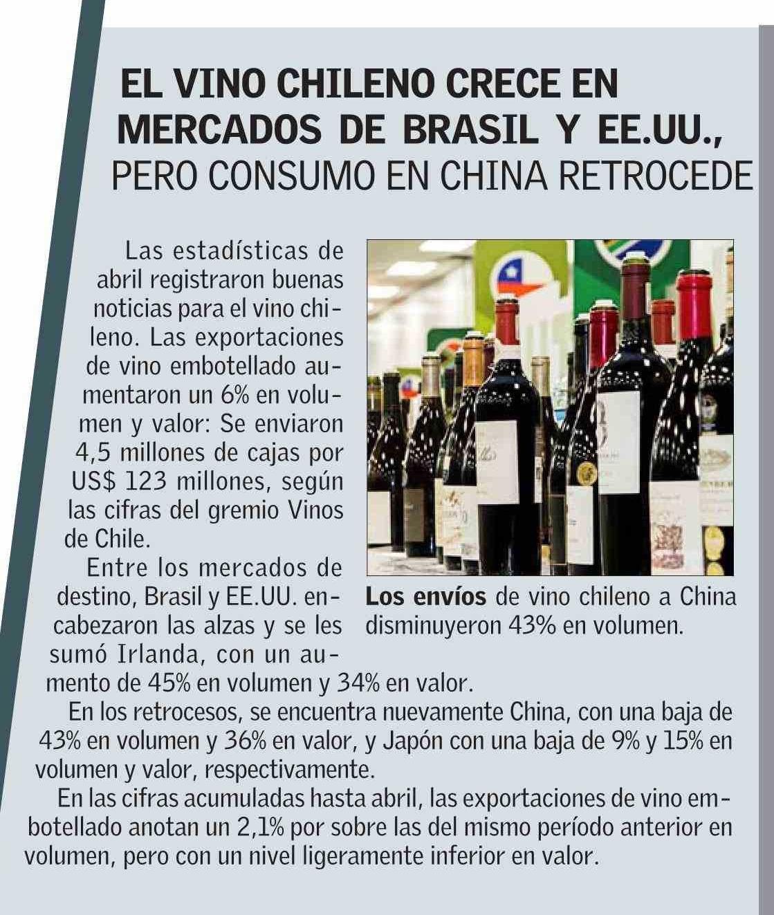 EL VINO CHILENO CRECE EN MERCADOS DE BRASIL Y EE.UU., PERO CONSUMO EN CHINA RETROCEDE