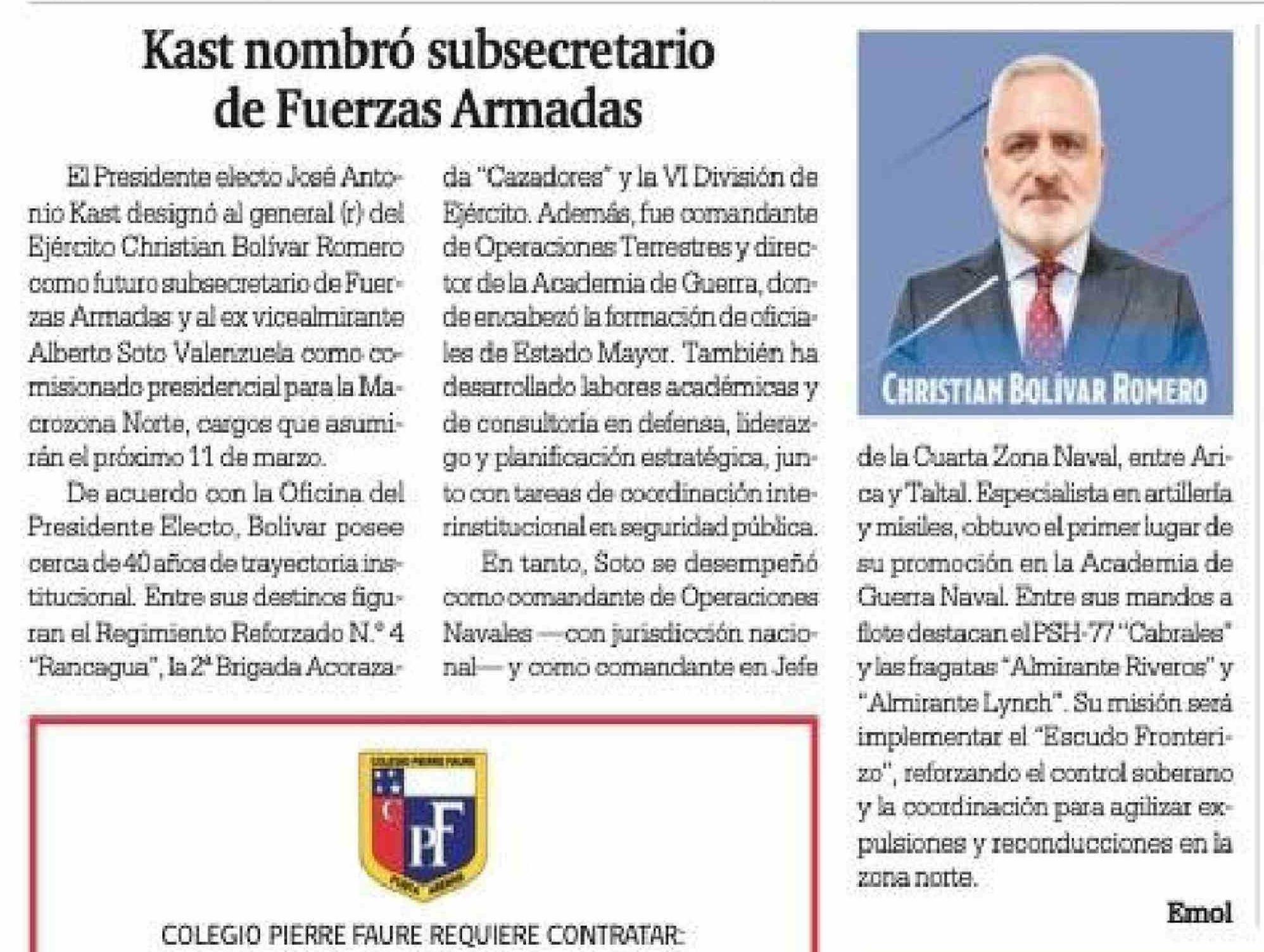 Kast nombró subsecretario de Fuerzas Armadas