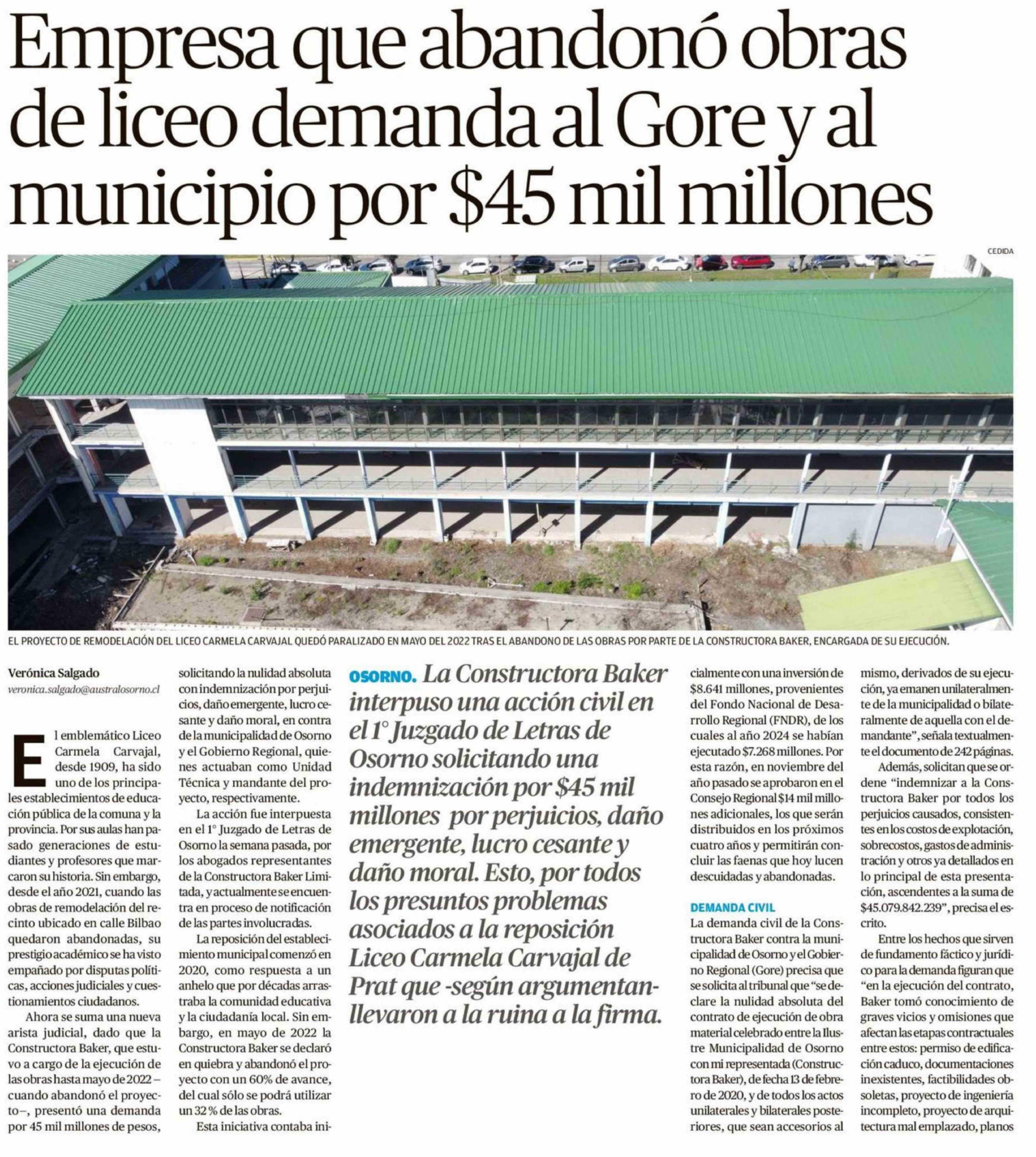 Empresa que abandonó obras de liceo demanda al Gore y al municipio por $45 mil millones