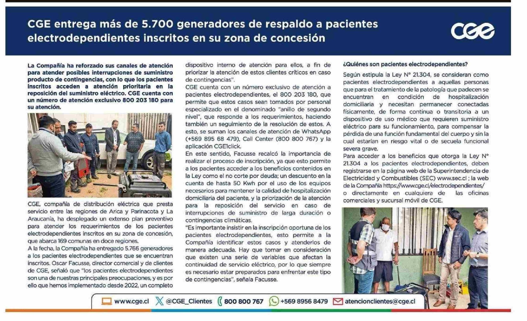 CGE entrega más de 5.700 generadores de respaldo a pacientes electrodependientes inscritos en su zona de concesión