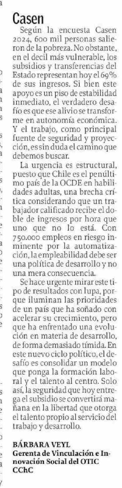 | Título: | Cartas: Casen Según la encuesta Casen 2024, 600 mil personas salieron de la pobreza. No obstante, en el decil más vulnerable, los subsidios y transferencias del Estado representan hoy el 69% de sus ingresos. Si bien este apoyo es un piso de estabilidad inmediato, el verdadero desafío es que ese aliv |