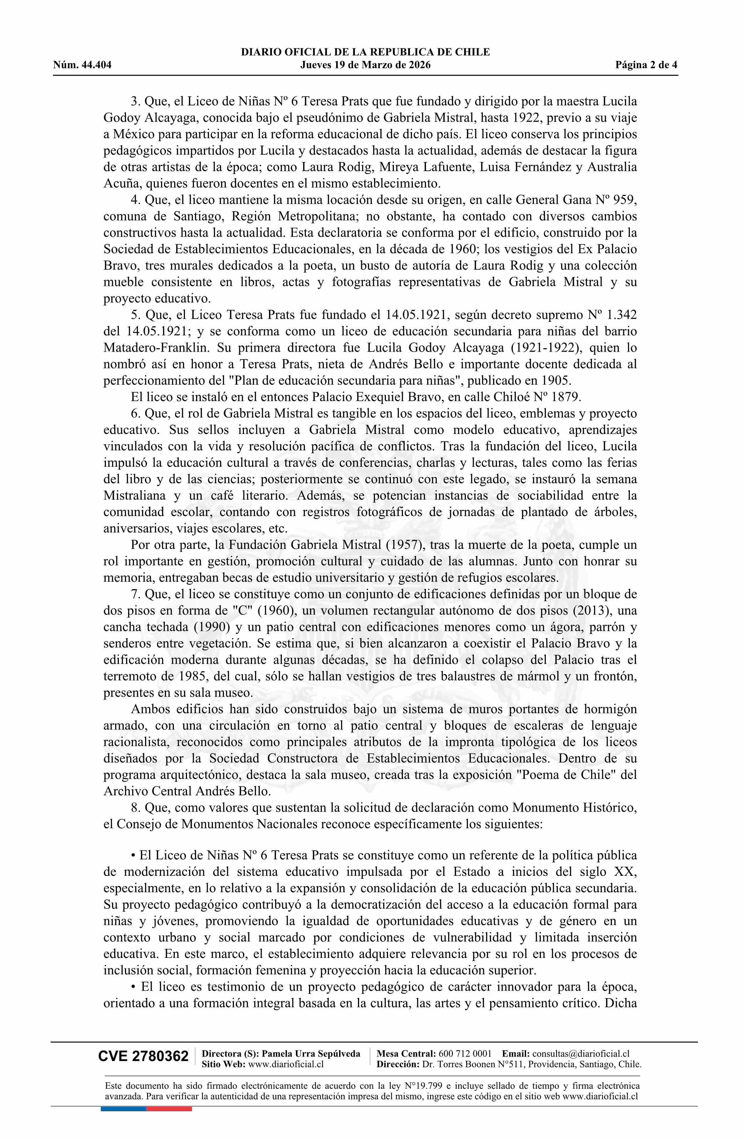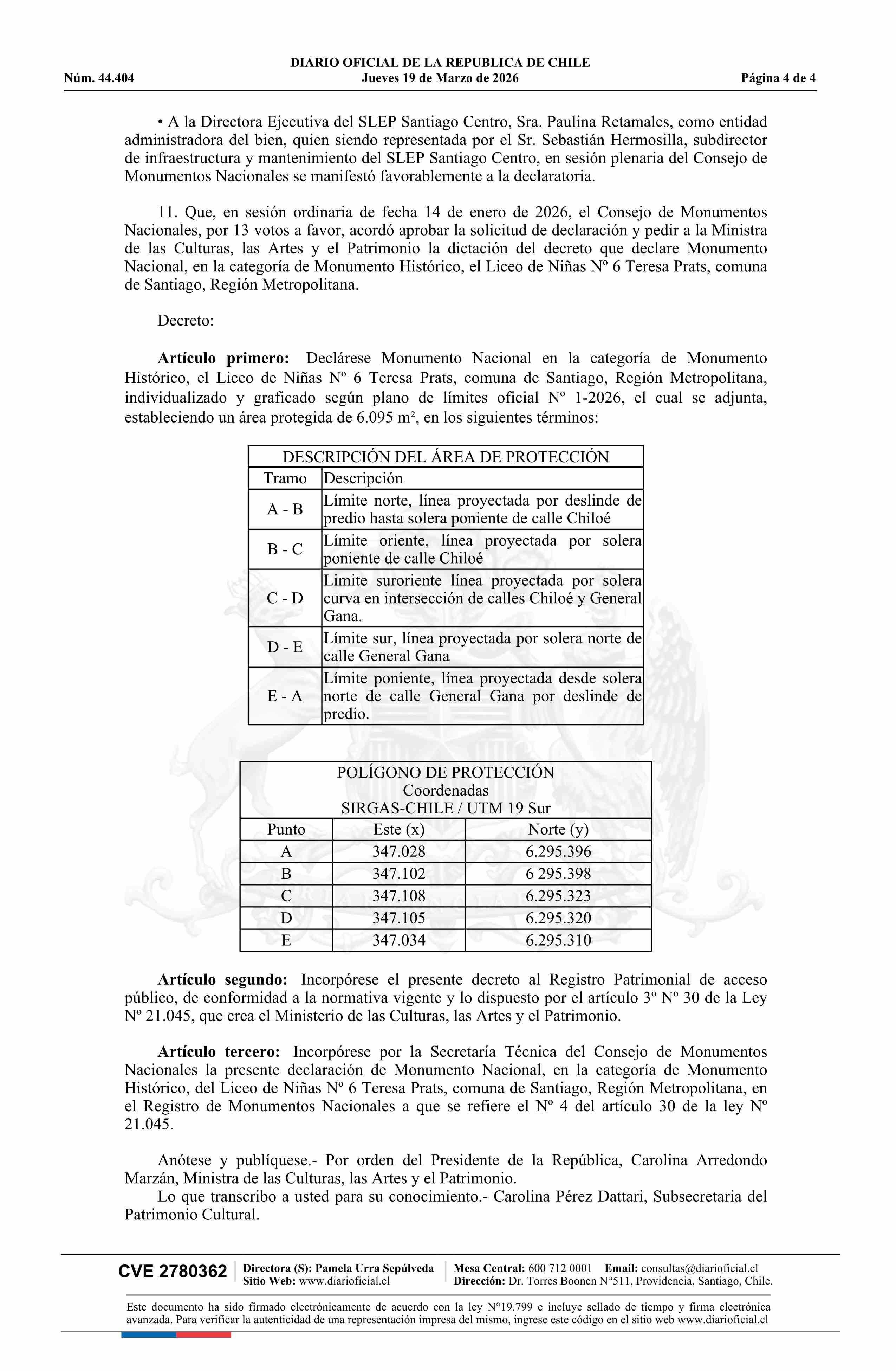 Título: Decreto exento número 34, de 2026.- Declara Monumento Nacional, en la Categoría de Monumento Histórico, el Liceo de Niñas Nº 6, Teresa Prats, comuna de Santiago, Región Metropolitana de Santiago