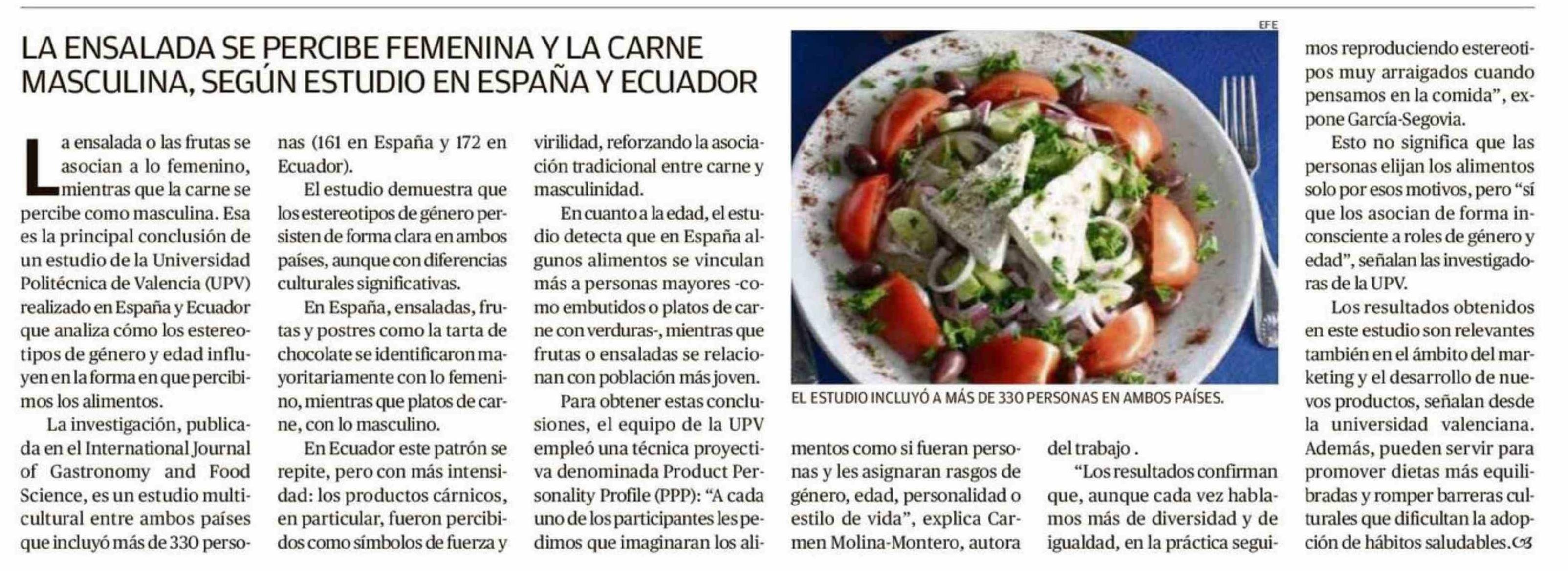 Título: LA ENSALADA SE PERCIBE FEMENINA Y LA CARNE MASCULINA, SEGÚN ESTUDIO EN ESPAÑA Y ECUADOR