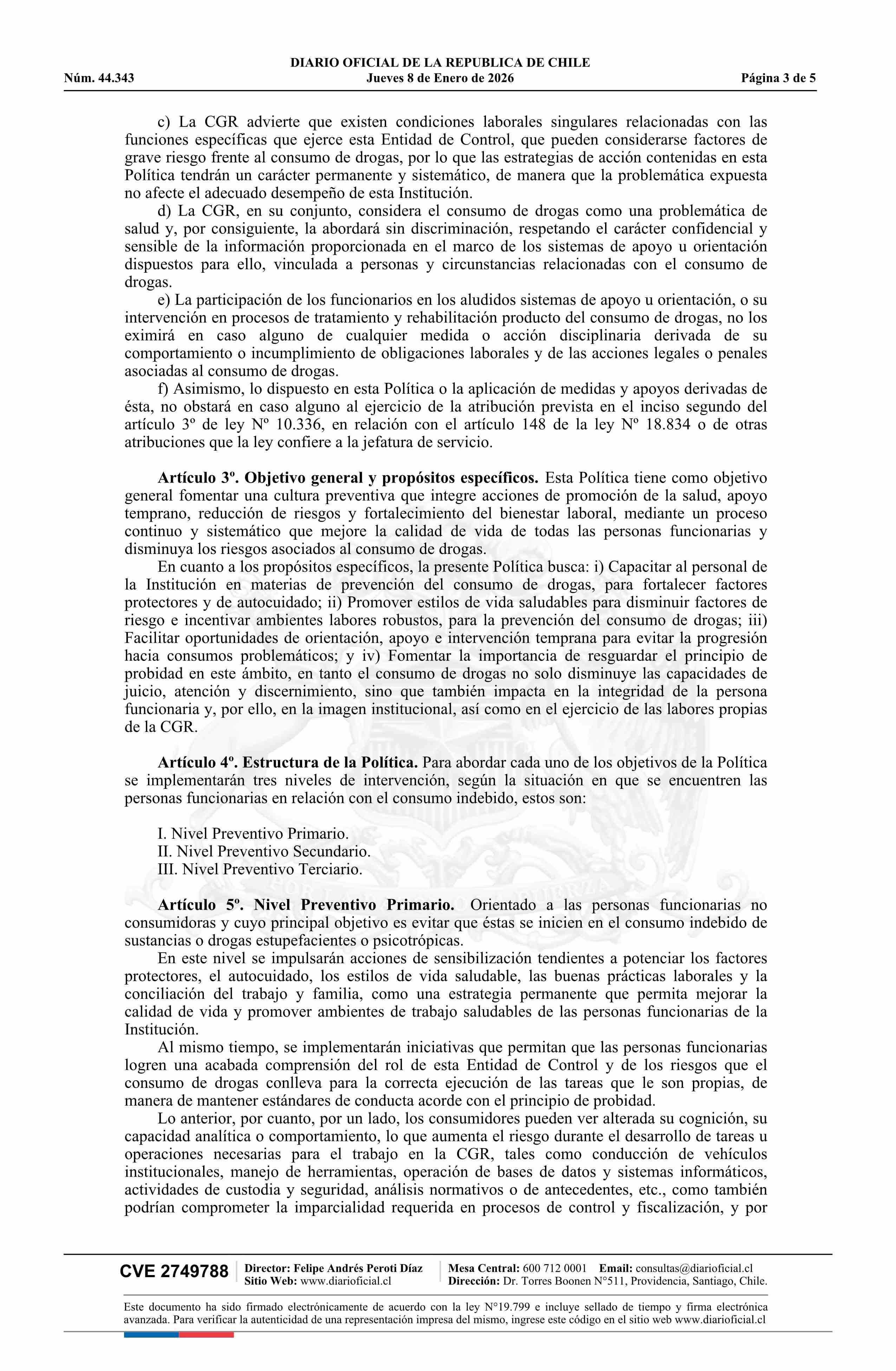 | Título: | Resolución exenta número 2.453, de 2025.- Establece política general de prevención del consumo de drogas en la Contraloría General de la República |