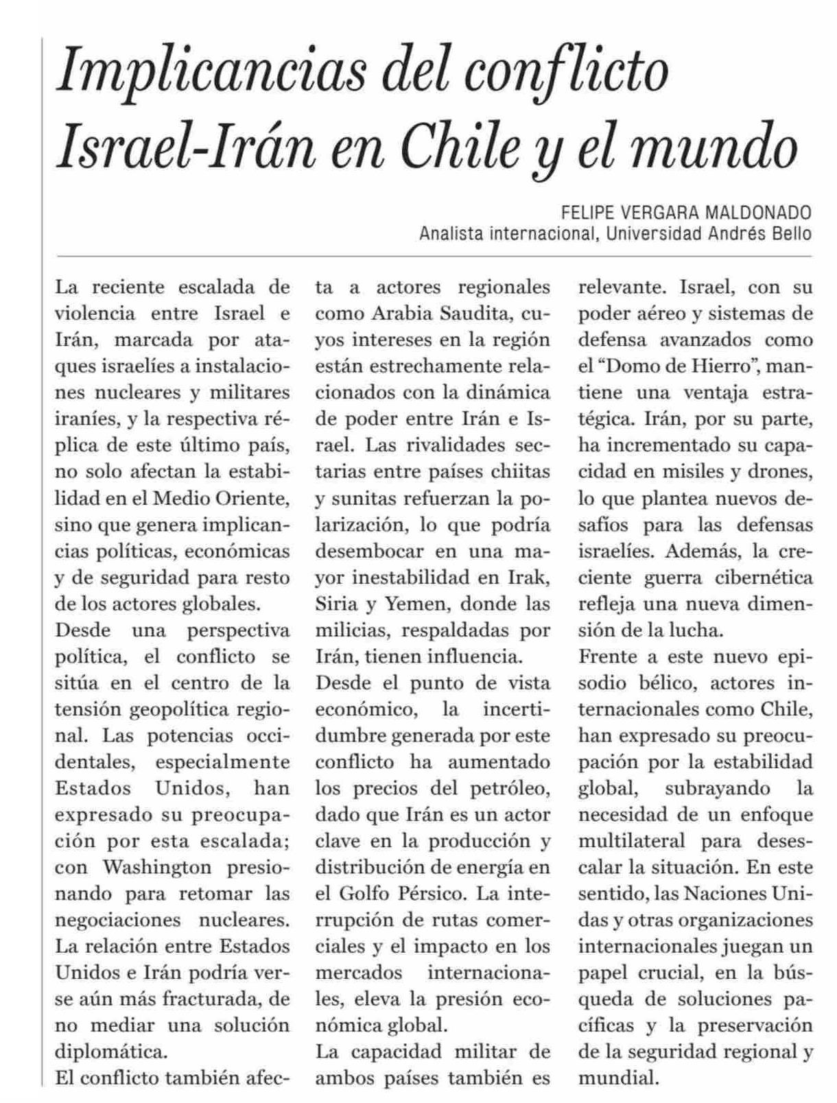 COLUMNAS DE OPINIÓN: Implicancias del conflicto Israel-Irán en Chile u el mundo
