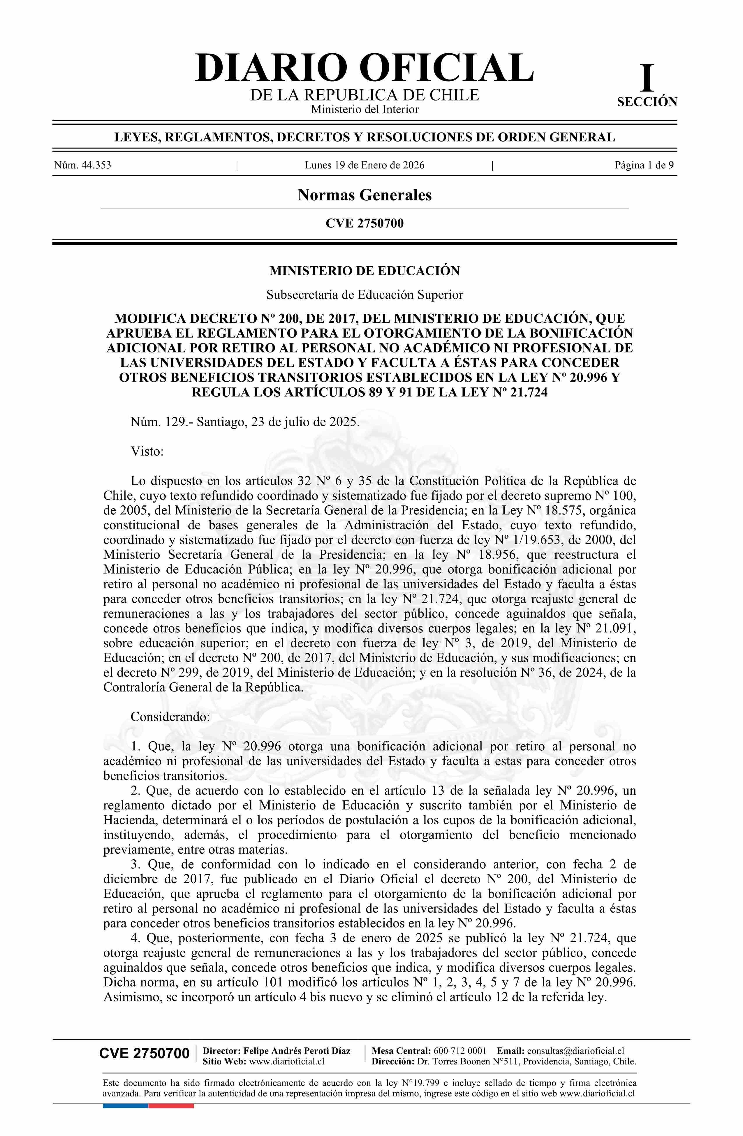 Título: Decreto número 129, de 2025.- Modifica decreto Nº 200, de 2017, que aprueba el Reglamento para el otorgamiento de la bonificación adicional por retiro al personal no académico ni profesional de las universidades del Estado y faculta a éstas para conceder otros beneficios transitorios establecidos en