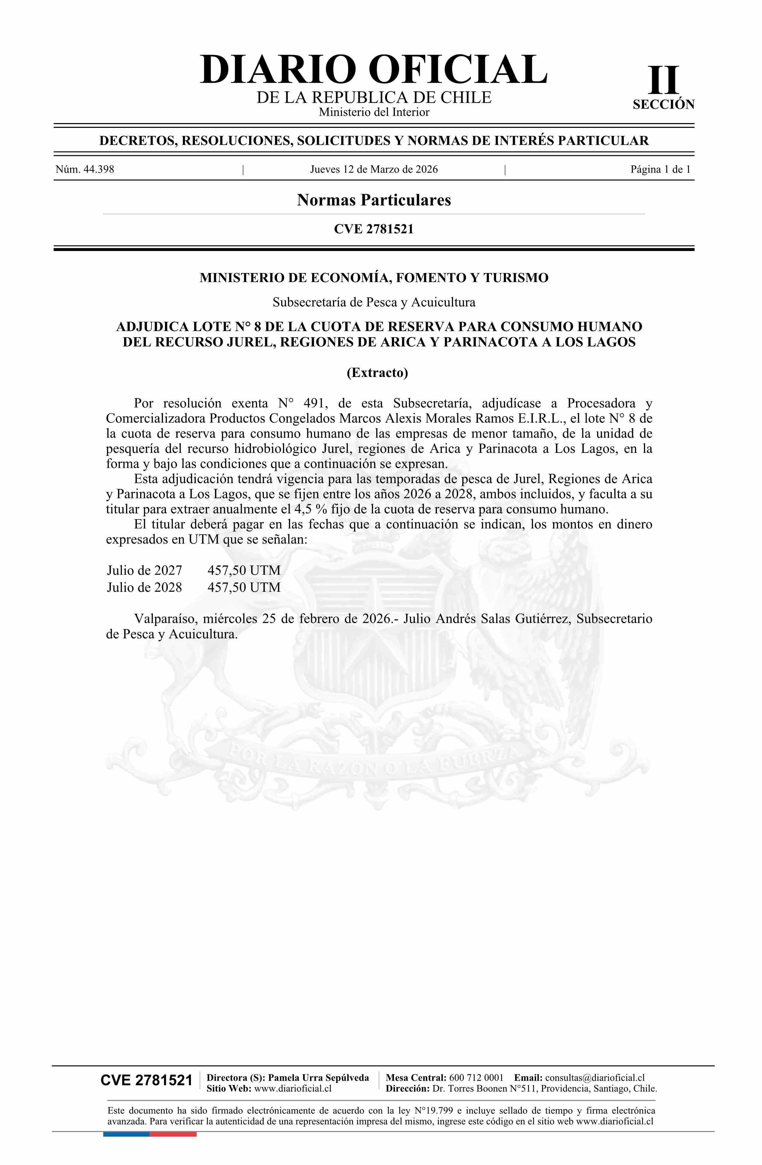 | Título: | Extracto de resolución exenta número 491, de 2026.- Adjudica lote N° 8 de la cuota de reserva para consumo humano del recurso Jurel, regiones de Arica y Parinacota a Los Lagos |