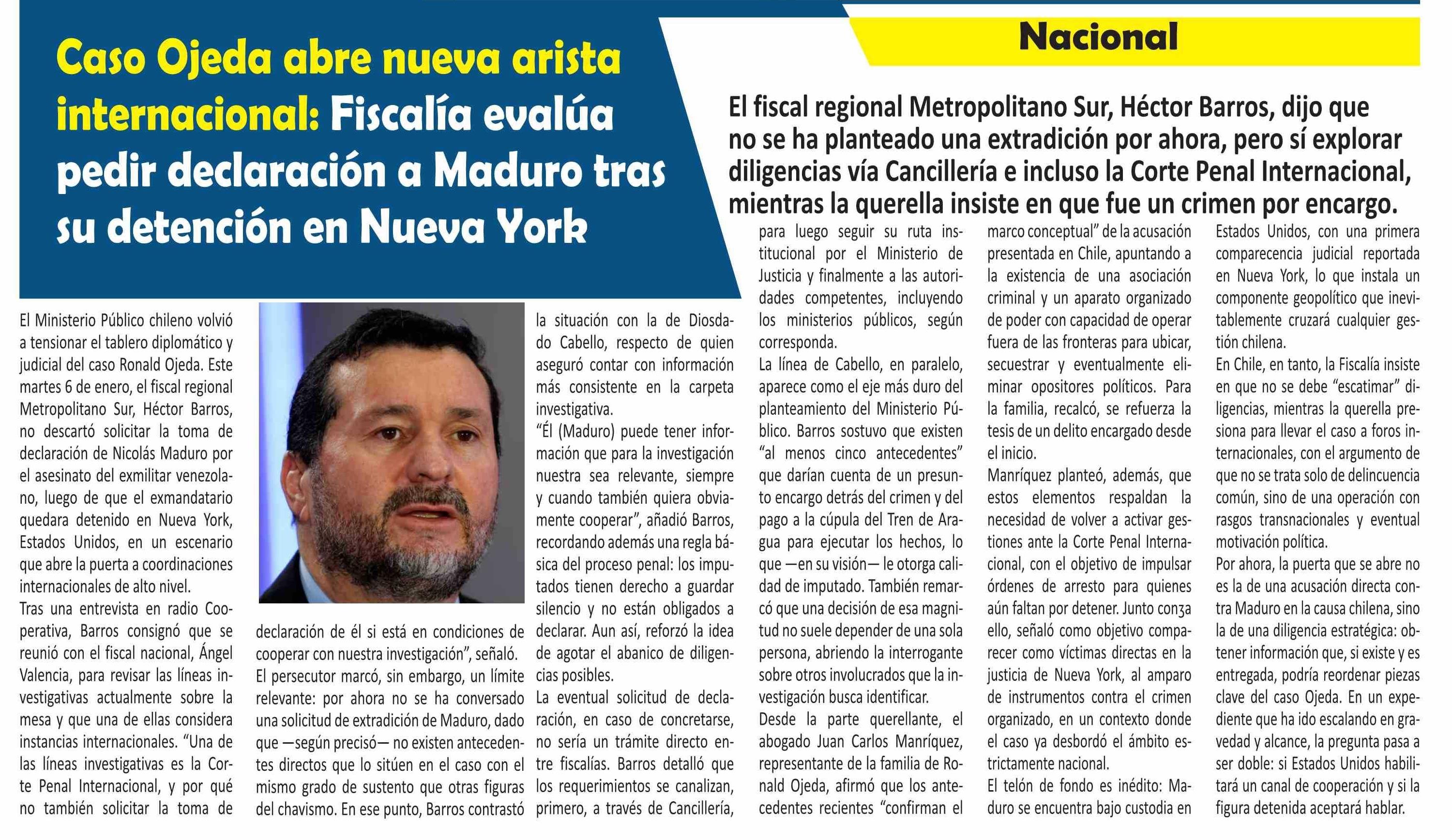 Caso Ojeda abre nueva arista internacional: Fiscalía evalúa pedir declaración a Maduro tras su detención en Nueva York