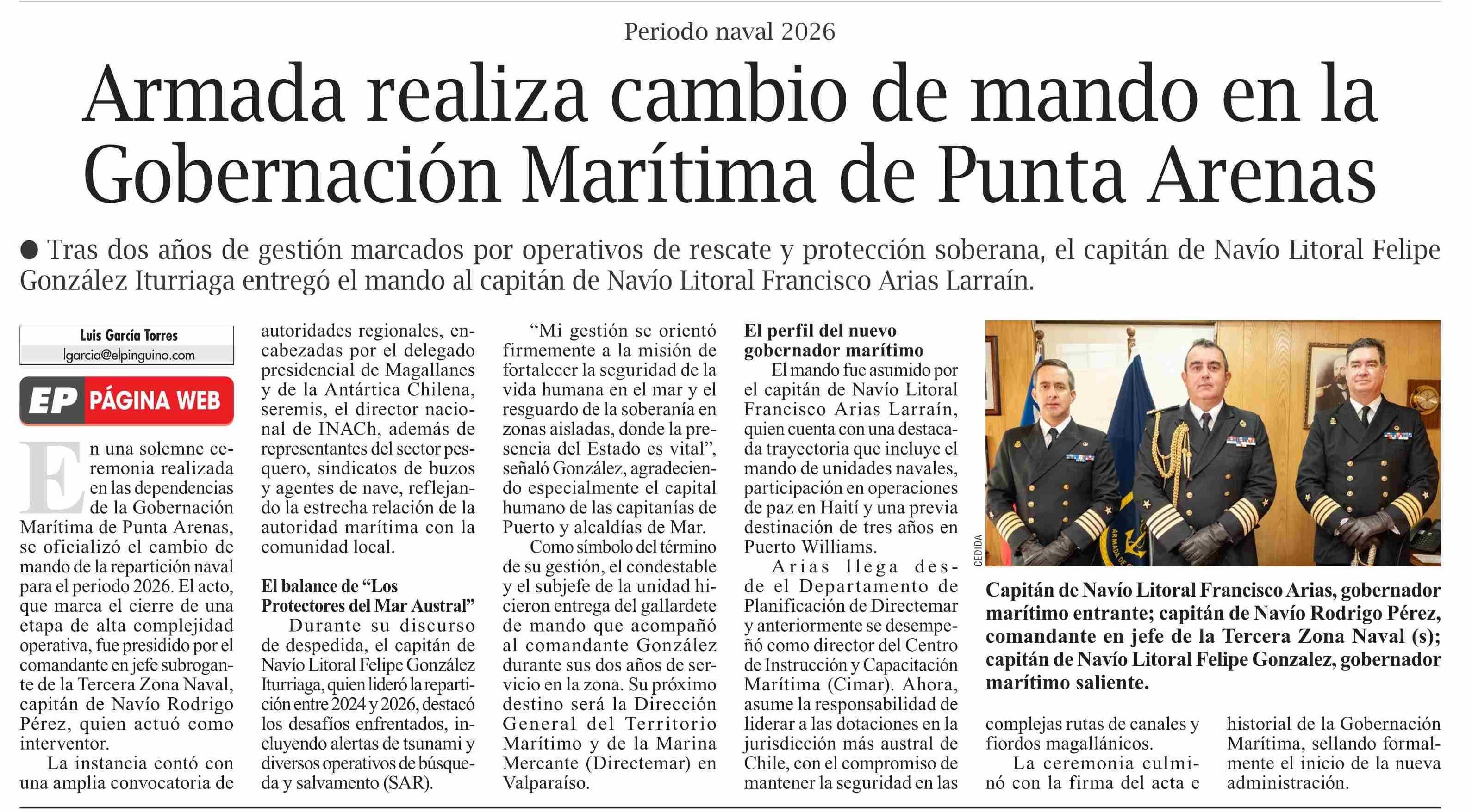 Armada realiza cambio de mando en la Gobernación Marítima de Punta Arenas