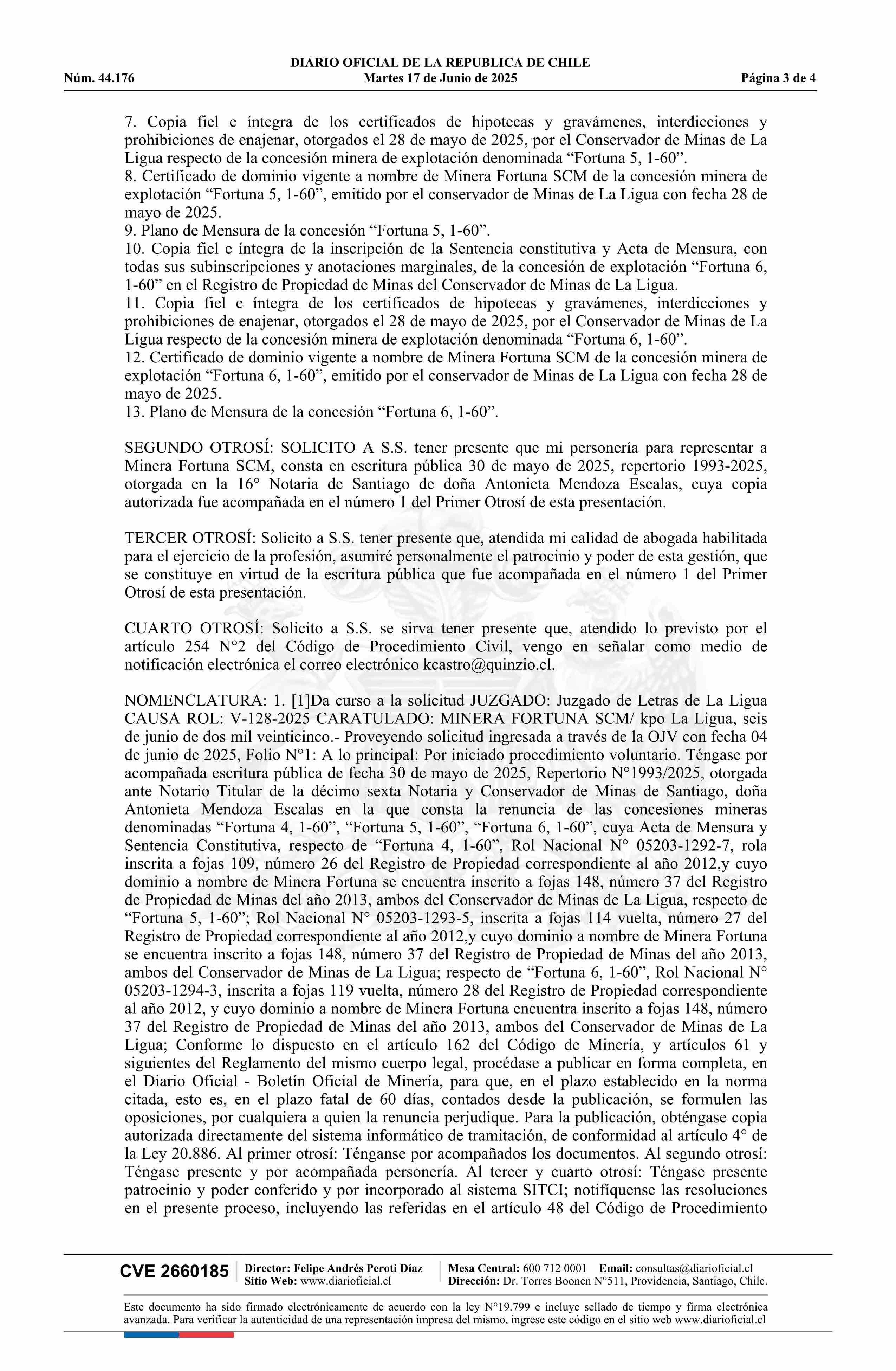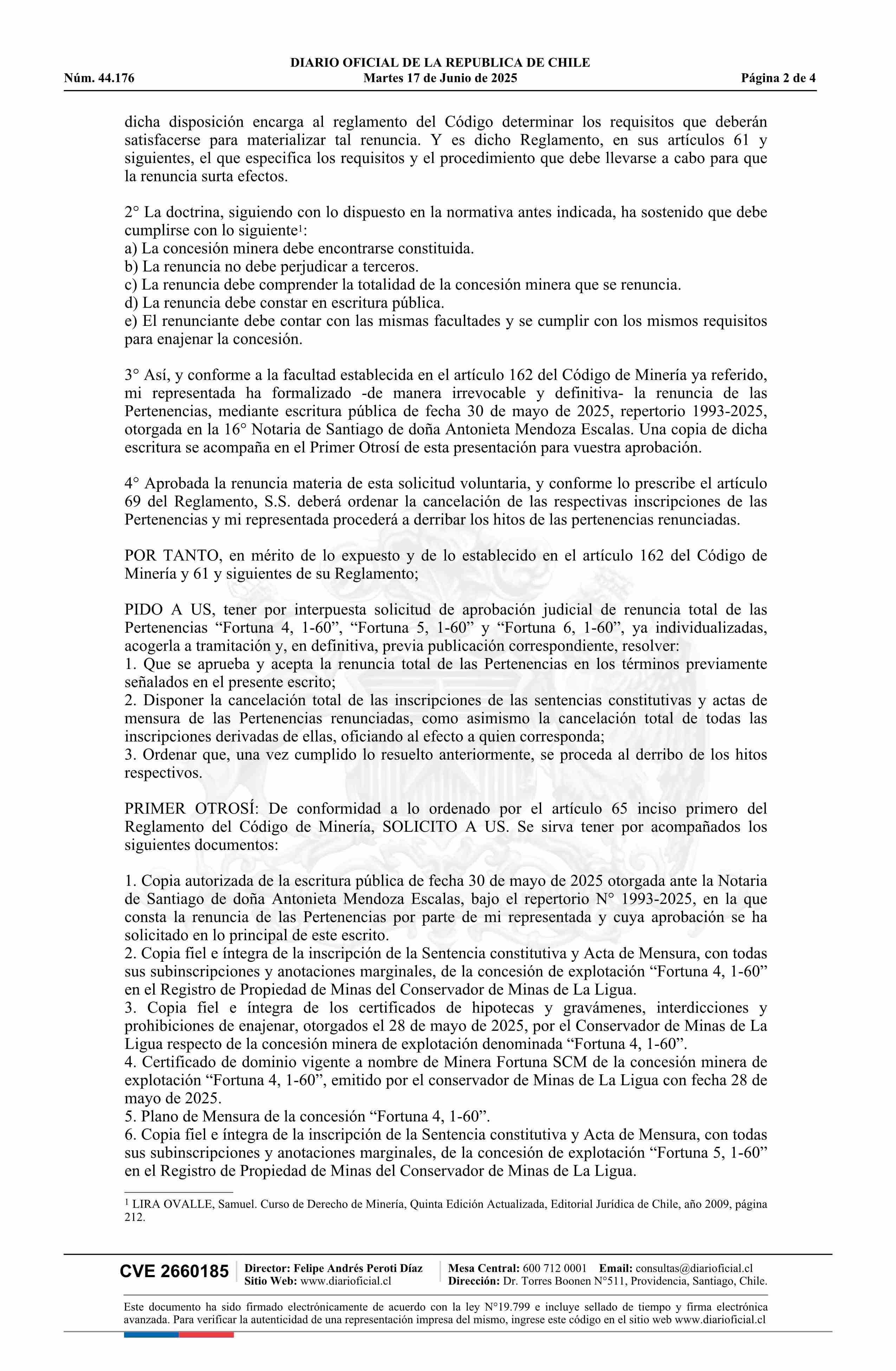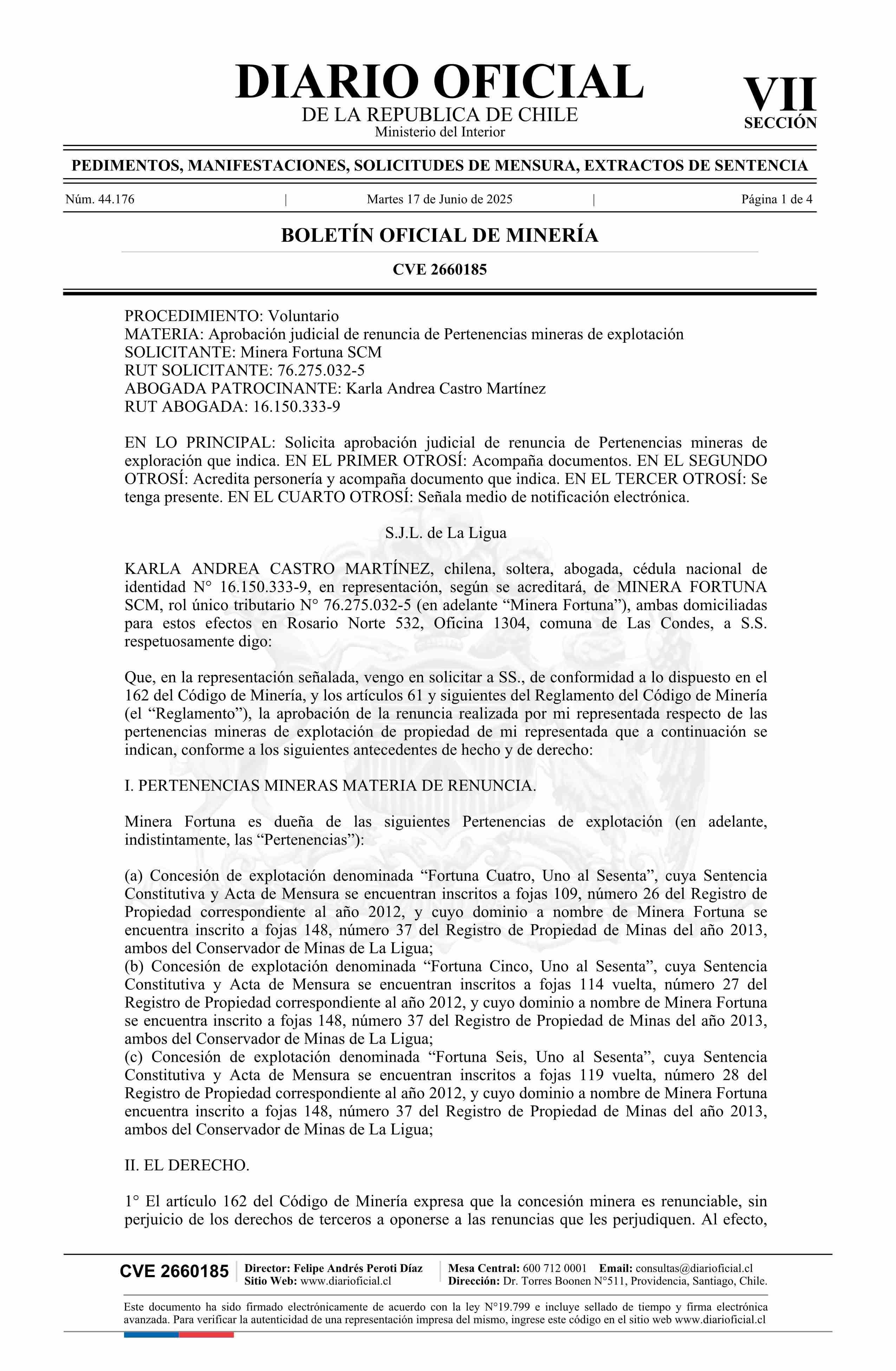 Fuente: DIARIO OFICIAL CHILE - BOLETÍN OFICIAL DE MINERÍA (DIARIO OFICIAL CHILE – BOM – RENUNCIAS CONCESIÓN) Página(s): 1-4