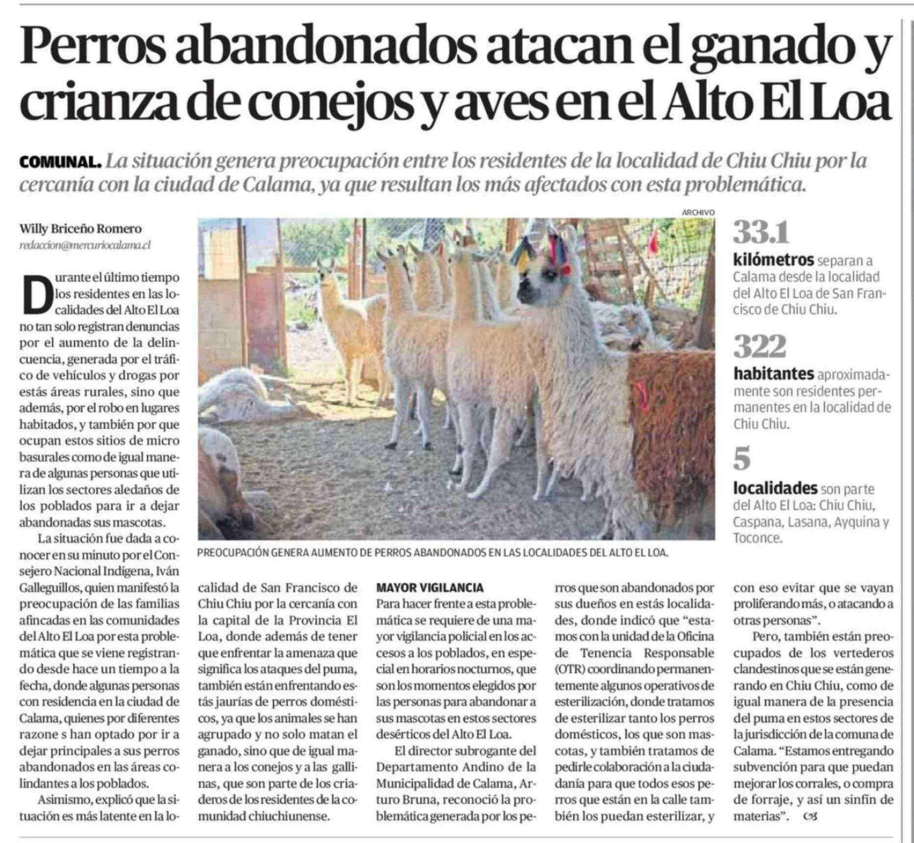 Perros abandonados atacan el ganado y crianza de conejos y aves en el Alto El Loa