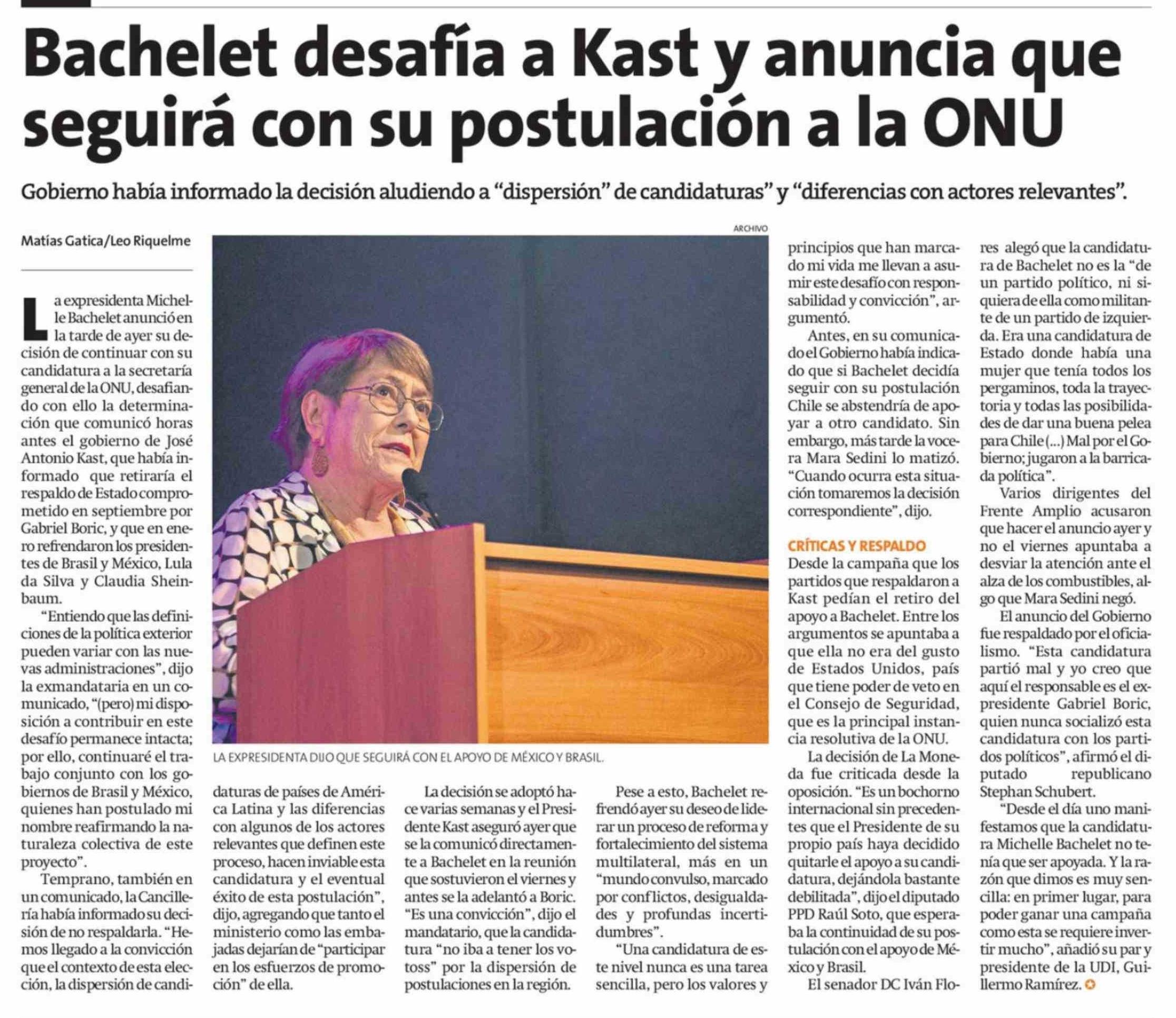 Bachelet desafía a Kast y anuncia que seguirá con su postulación a la ONU