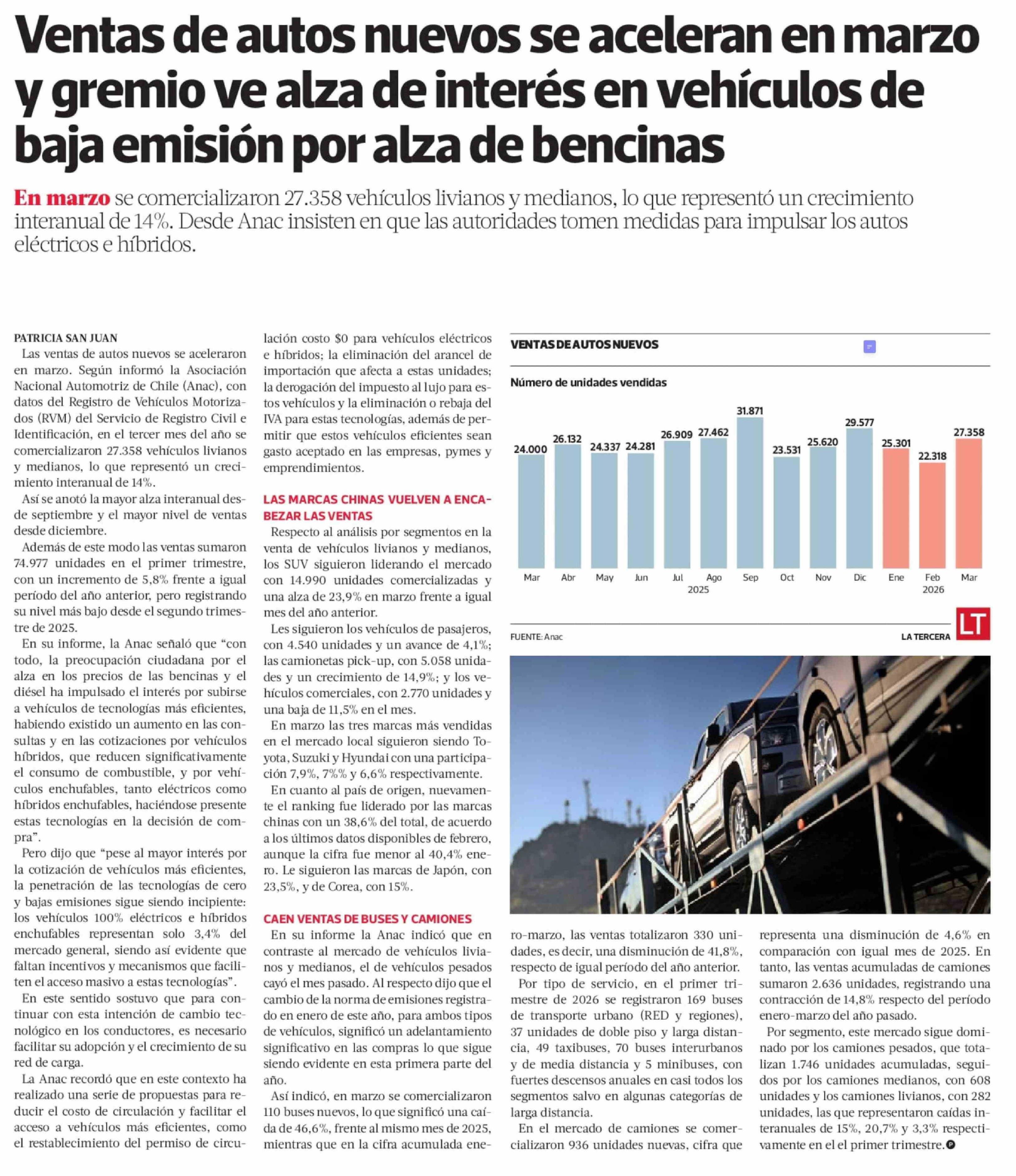 Ventas de autos nuevos se aceleran en marzo y gremio ve alza de interés en vehículos de baja emisión por alza de bencinas