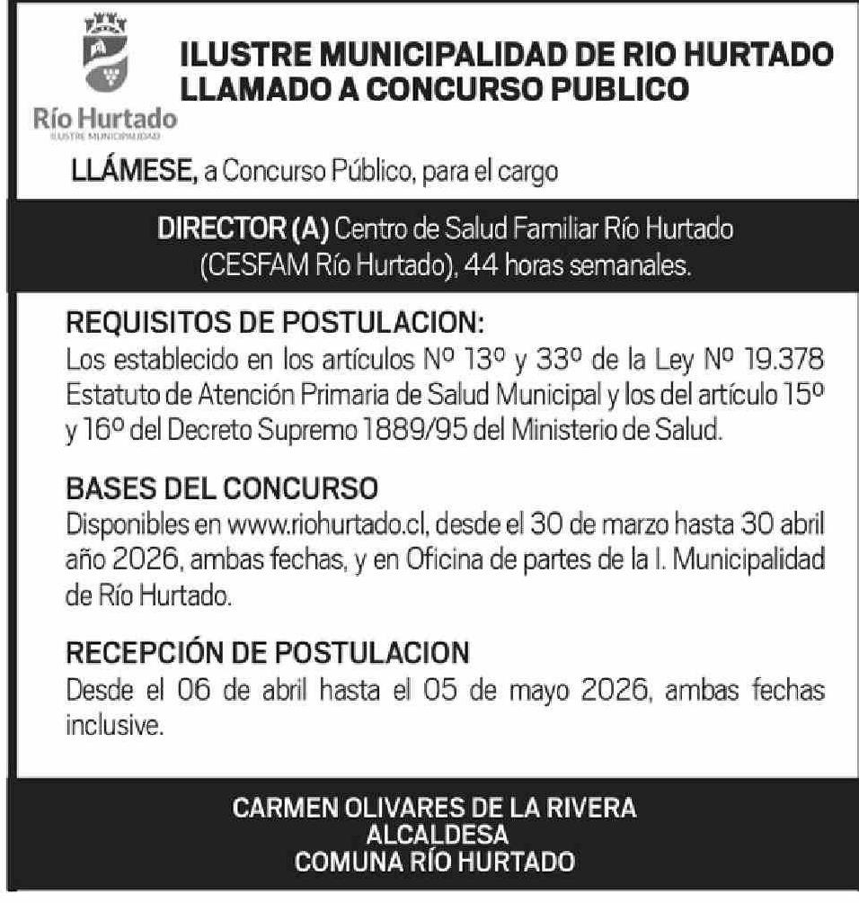 Aviso Licitaciones: ILUSTRE MUNICIPALIDAD DE RIO HURTADO EMPLEO CESFAM