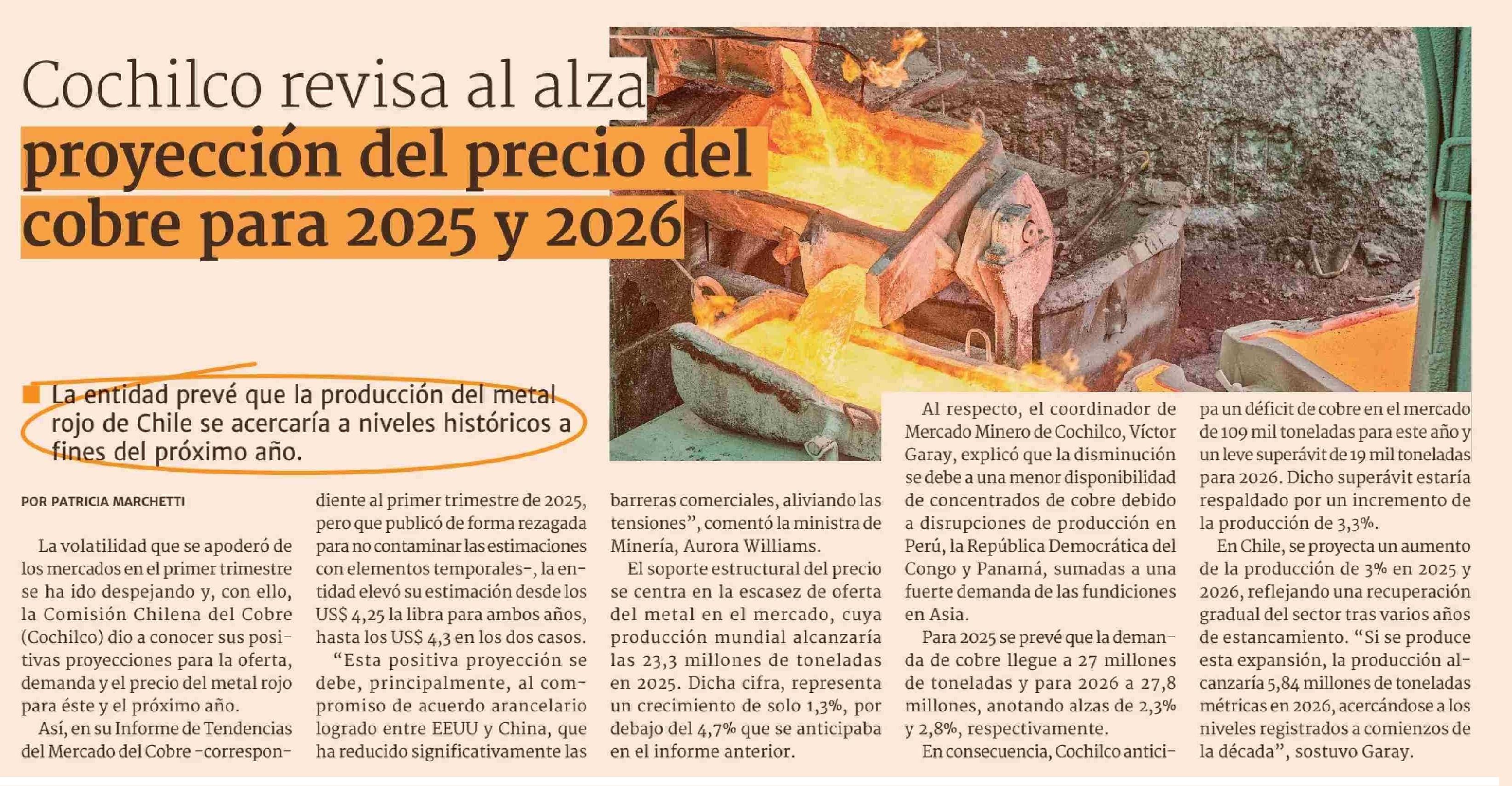 Cochilco revisa al alza proyección del precio del cobre para 2025 y 2026