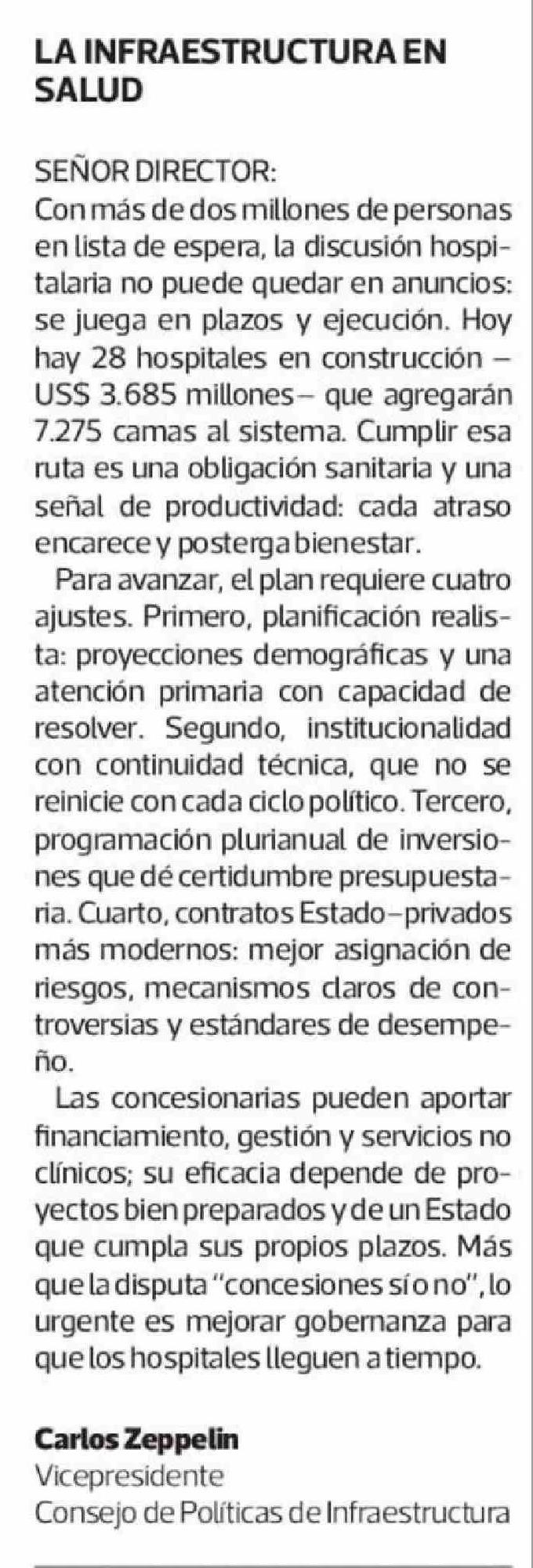 Cartas: LA INFRAESTRUCTURA EN SALUD