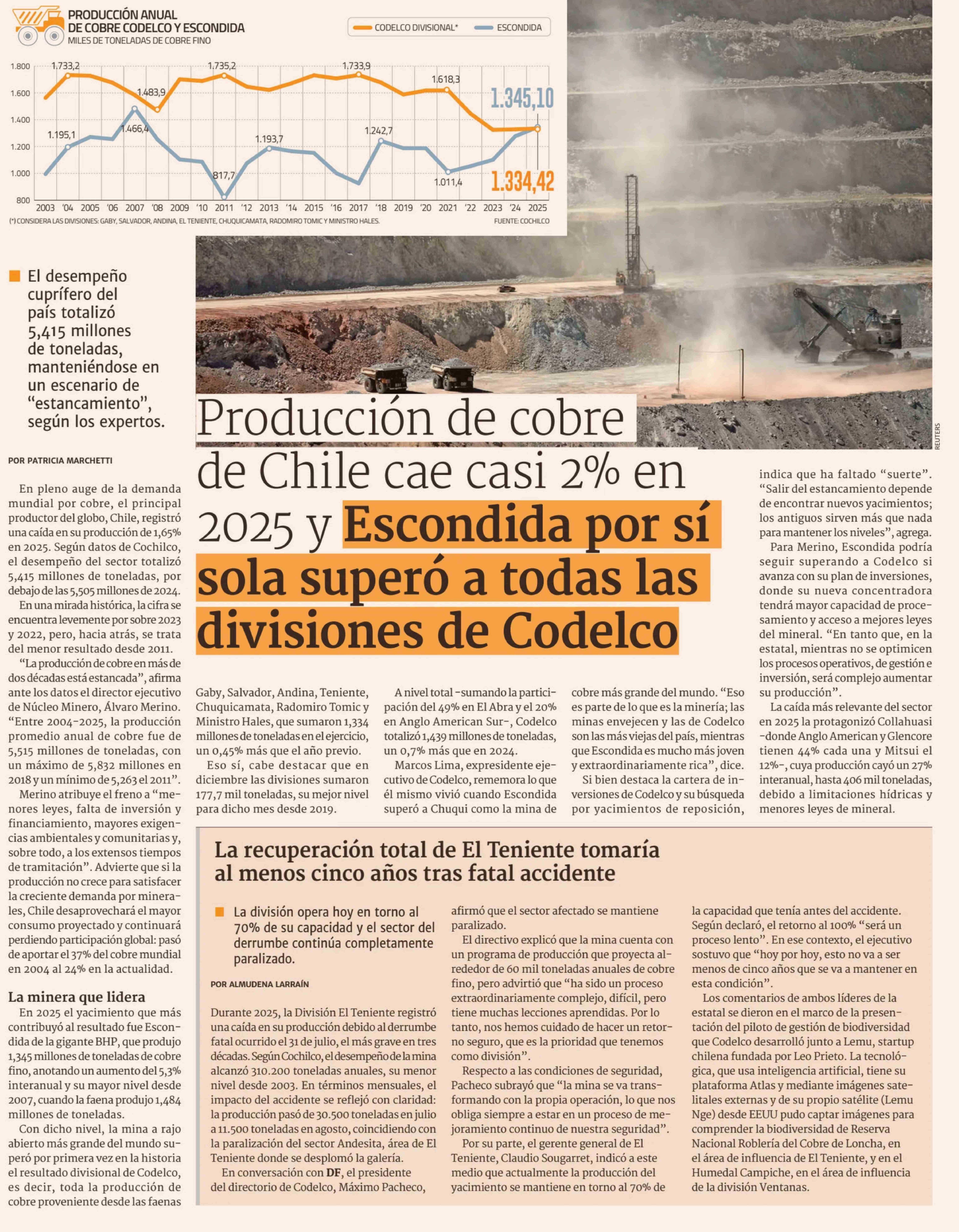 Producción de cobre de Chile cae casi 2% en 2025 y Escondida por sí sola superó a todas las divisiones de Codelco