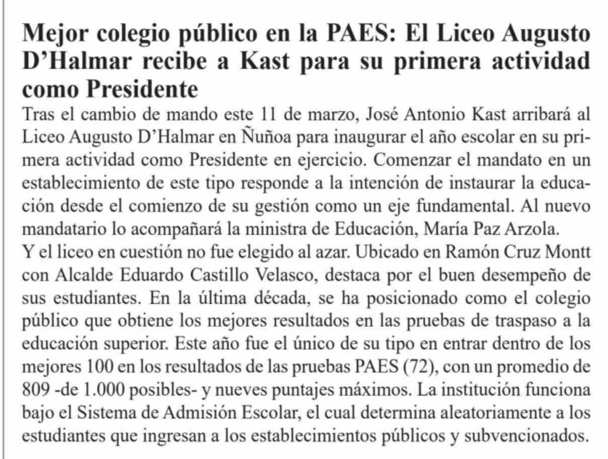 Mejor colegio público en la PAES: El Liceo Augusto D'Halmar recibe a Kast para su primera actividad como Presidente