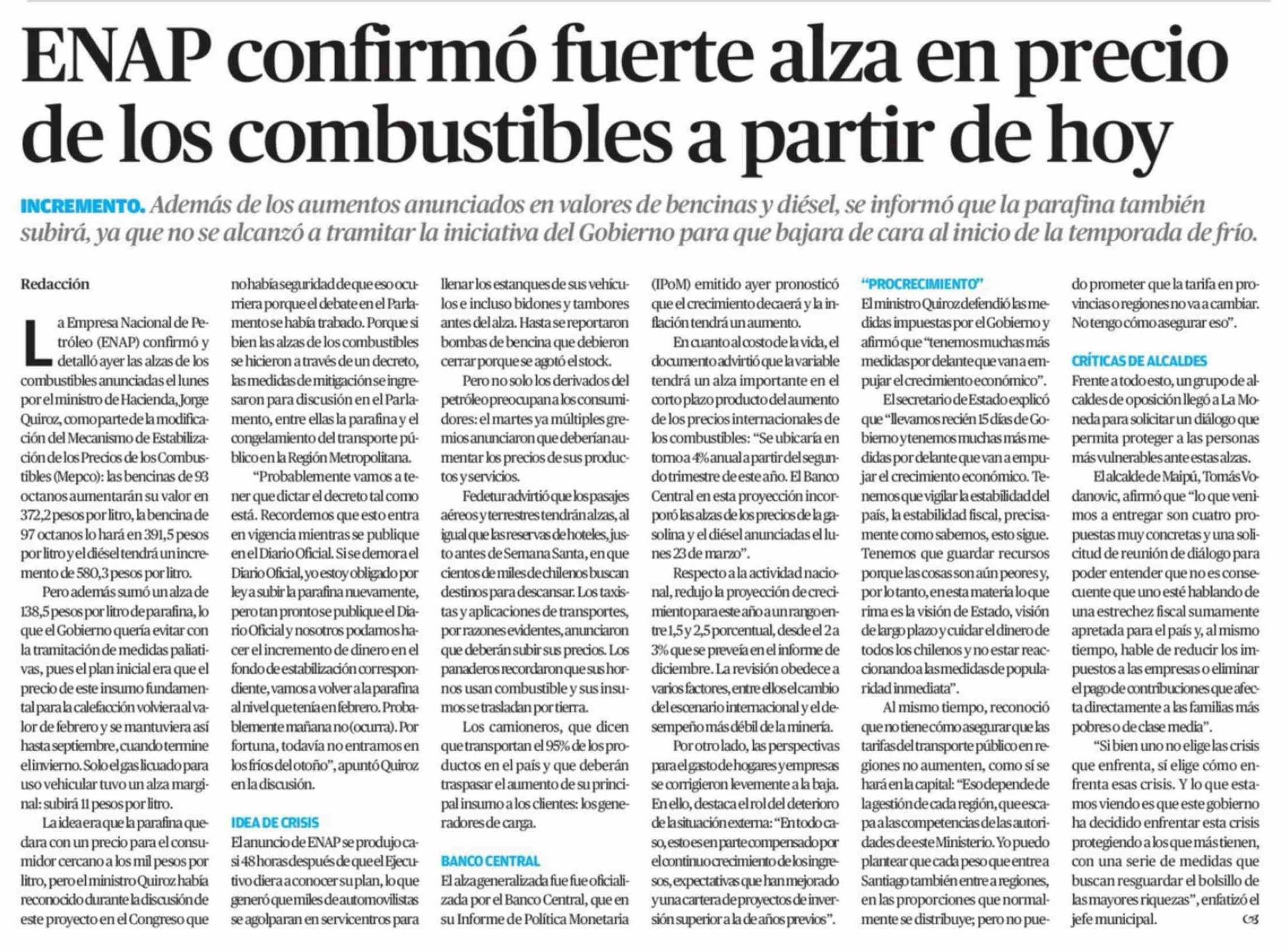 ENAP confirmó fuerte alza en precio de los combustibles a partir de hoy