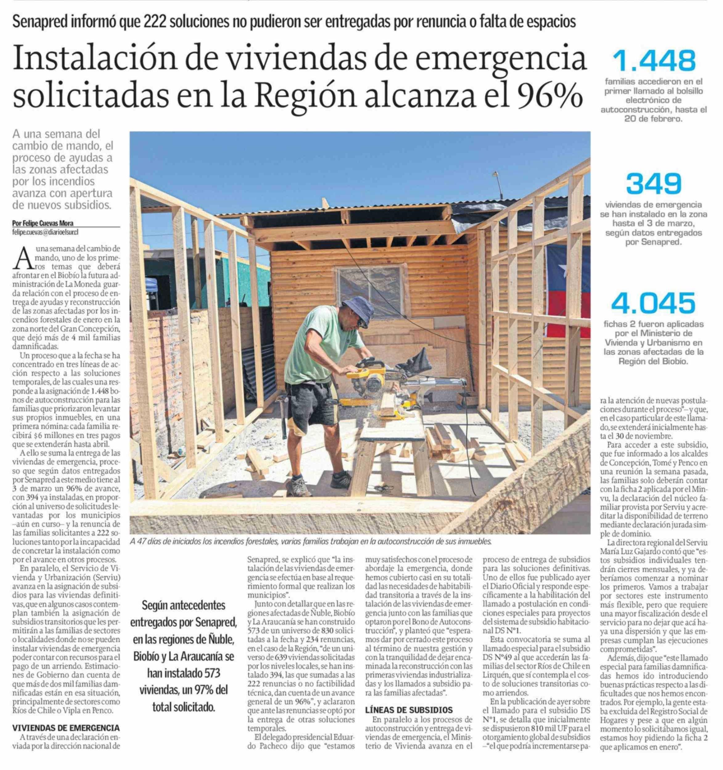 Instalación de viviendas de emergencia solicitadas en la Región alcanza el 96%