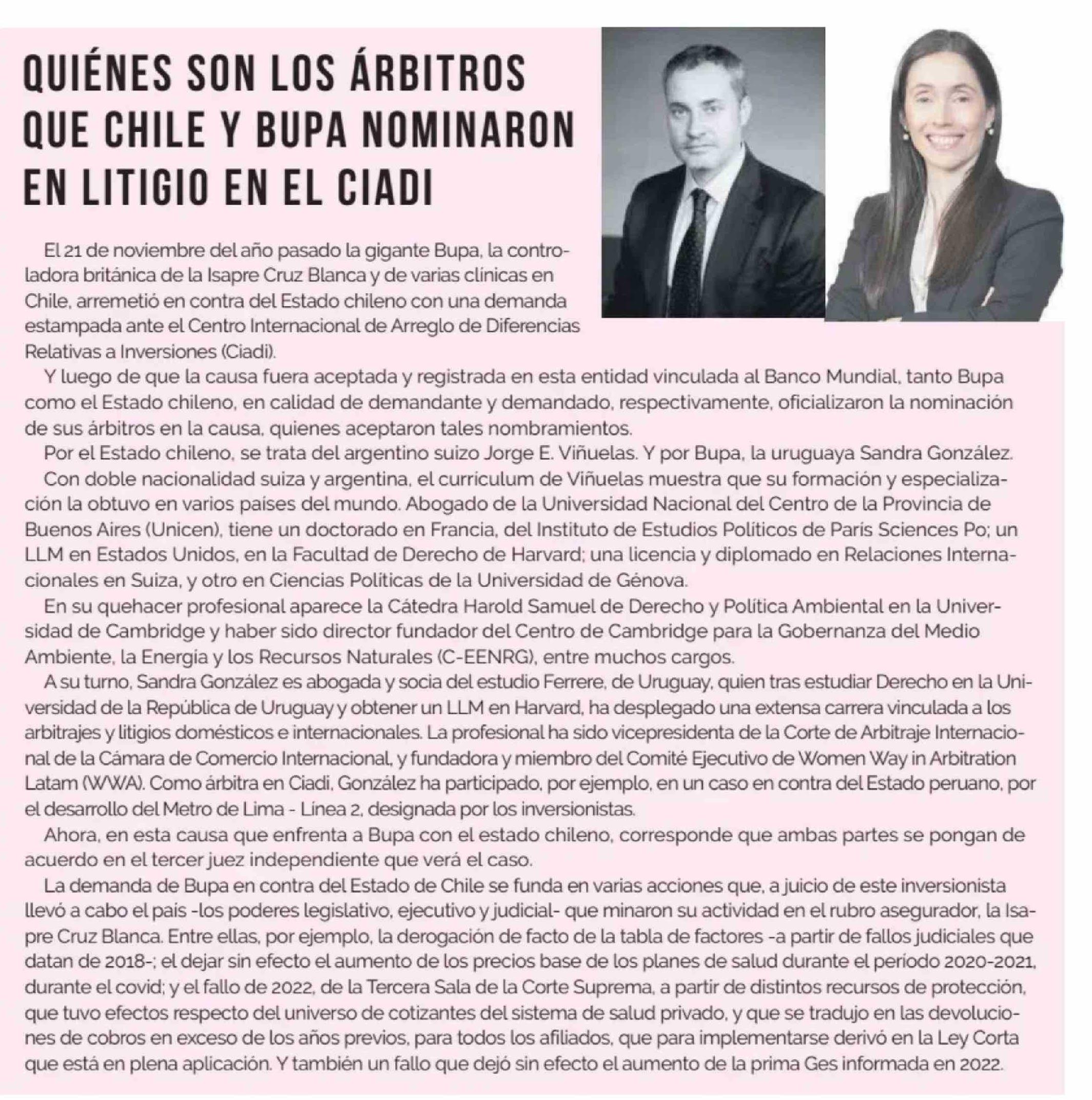 QUIÉNES SON LOS ÁRBITROS QUE CHILE Y BUPA NOMINARON EN LITIGIO EN EL CIADI