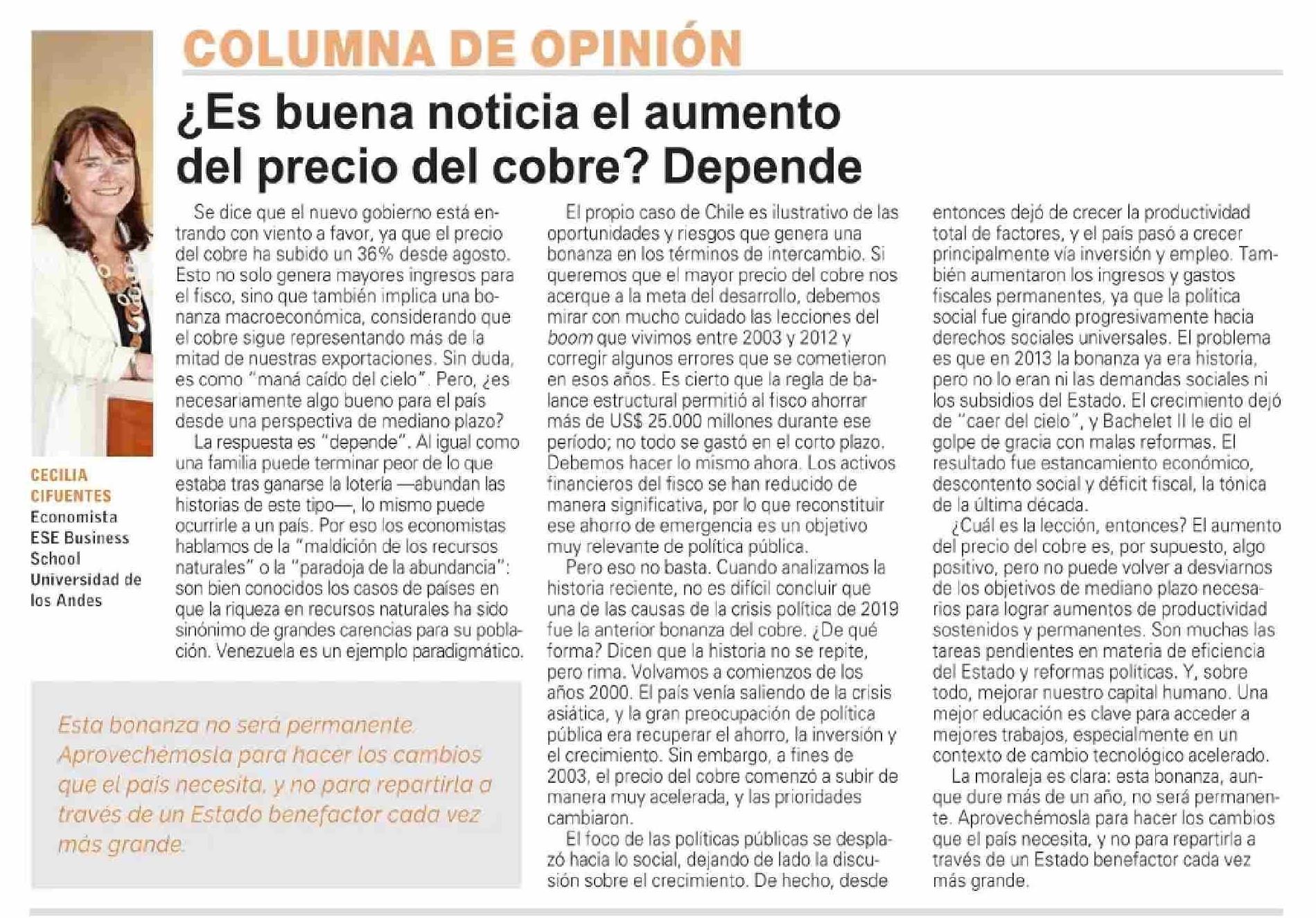 COLUMNAS DE OPINIÓN: ¿Es buena noticia el aumento del precio del cobre? Depende