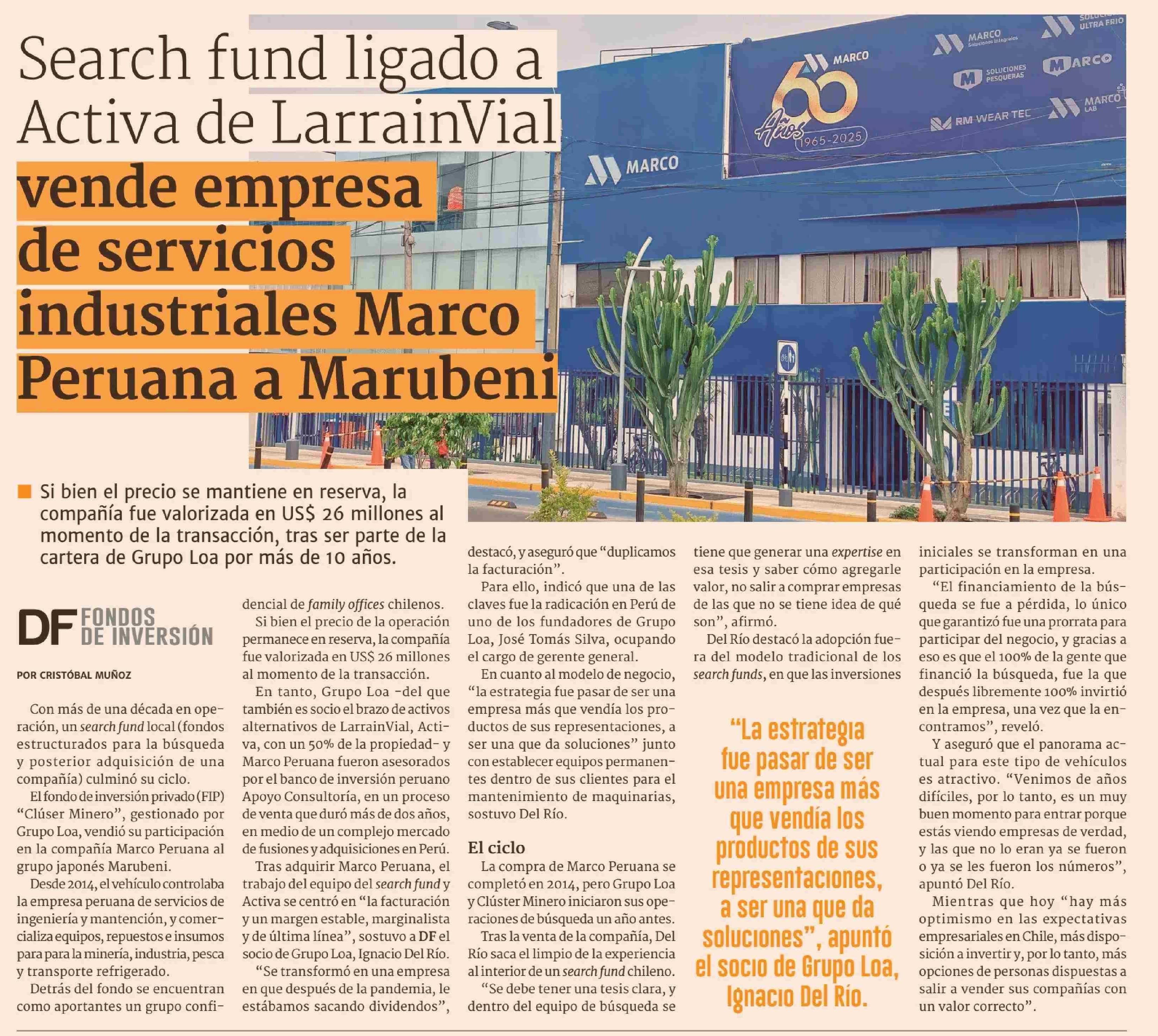 Search fund ligado a Activa de LarrainVial vende empresa de servicios industriales Marco Peruana a Marubeni