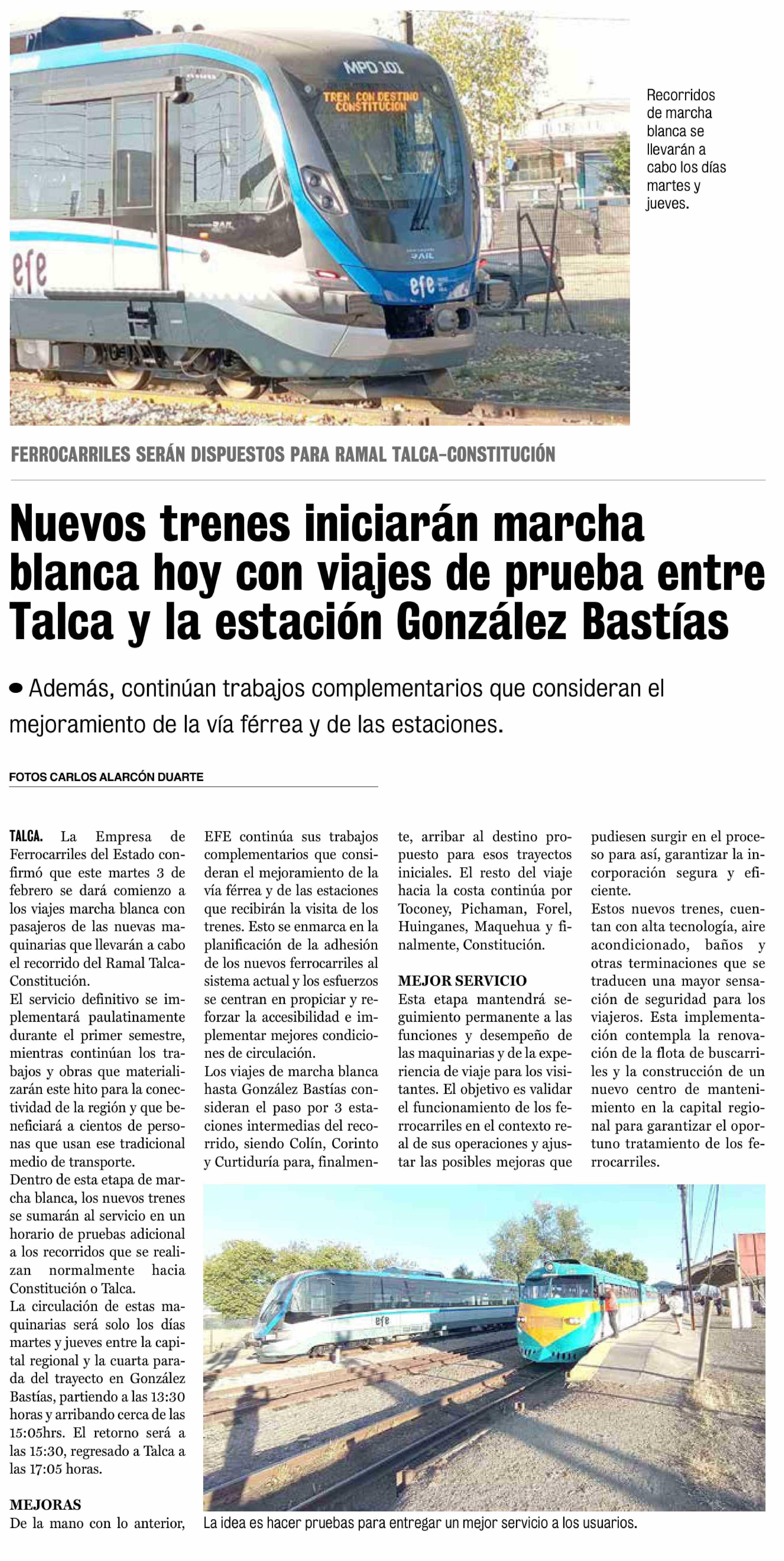 Nuevos trenes iniciarán marcha blanca hoy con viajes de prueba entre Talca y la estación González Bastías