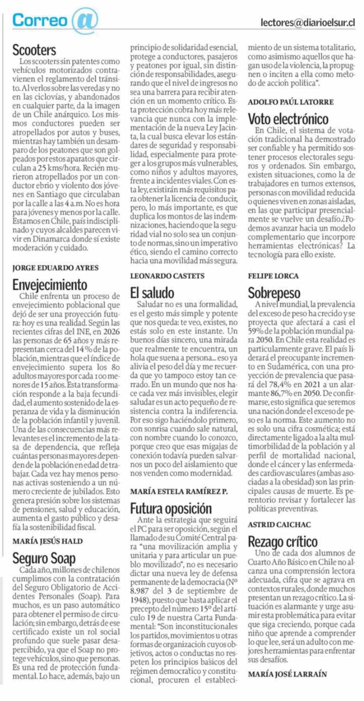 | Título: | Cartas: Scooters Los scooters sin patentes como vehículos motorizados contravienen el reglamento del tránsito. Alverlos sobre las veredas y no en las ciclovías, y abandonados en cualquier parte, da la imagen de un Chile anárquico. Los mismos conductores pueden ser atropellados por autos y buses, mie |