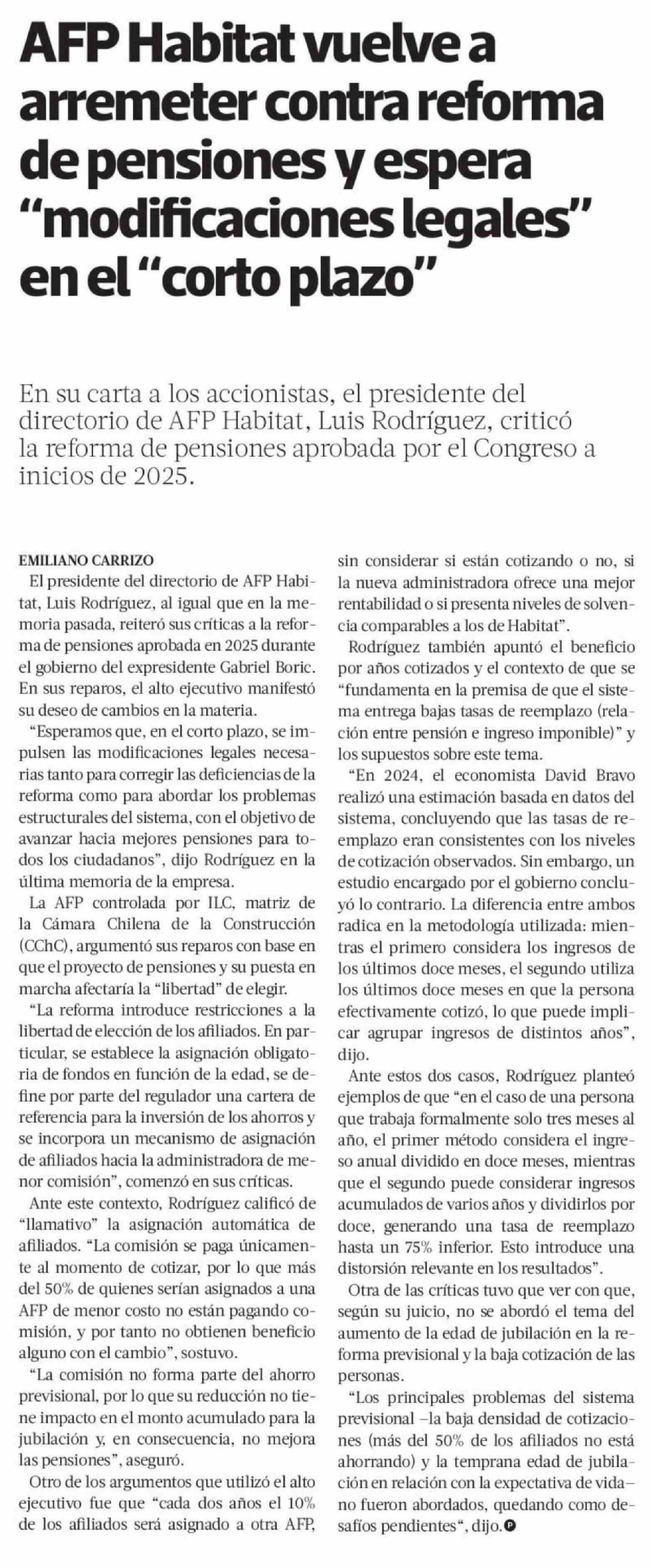 AFP Habitat vuelve a arremeter contra reforma de pensiones y espera "modificaciones legales" en el "corto plazo"