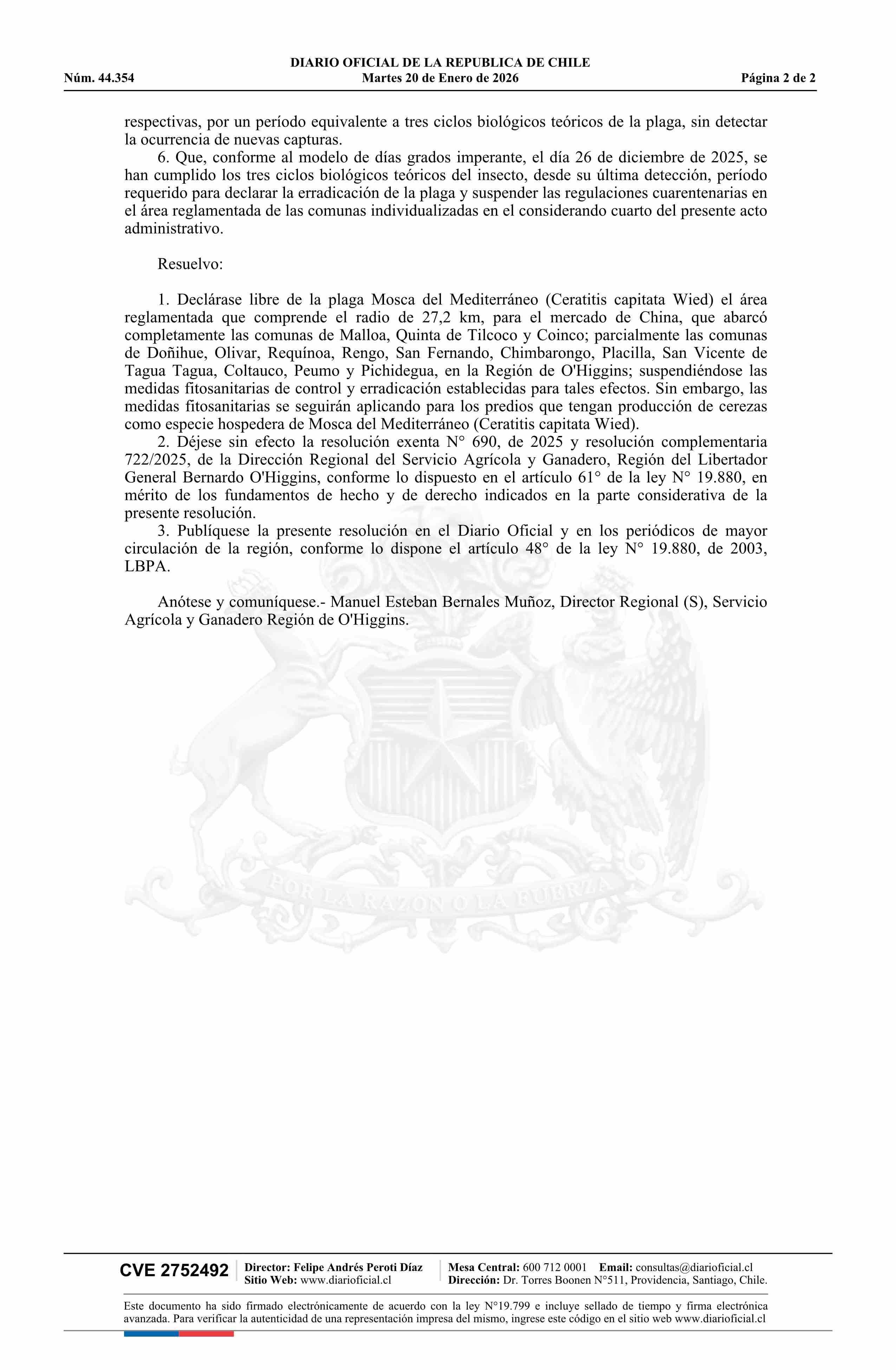 | Título: | Resolución exenta número 2.864, de 2025.- Declara libre de mosca del mediterráneo (Ceratitis capitata Wied) el área reglamentada que indica, Región de O'Higgins, mercado de China 27,2 km brote Malloa |