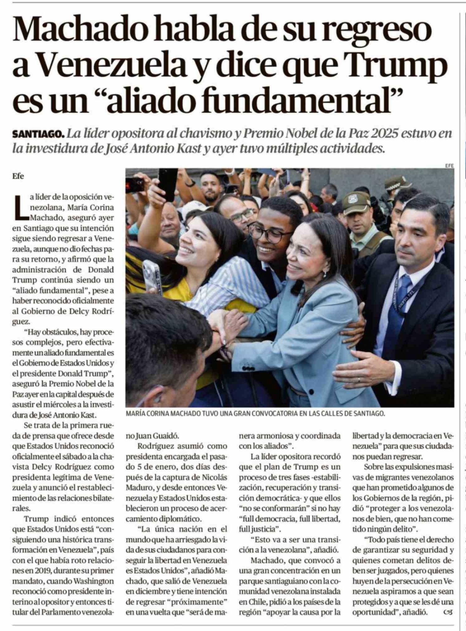 Machado habla de su regreso a Venezuela y dice que Trump es un "aliado fundamental"