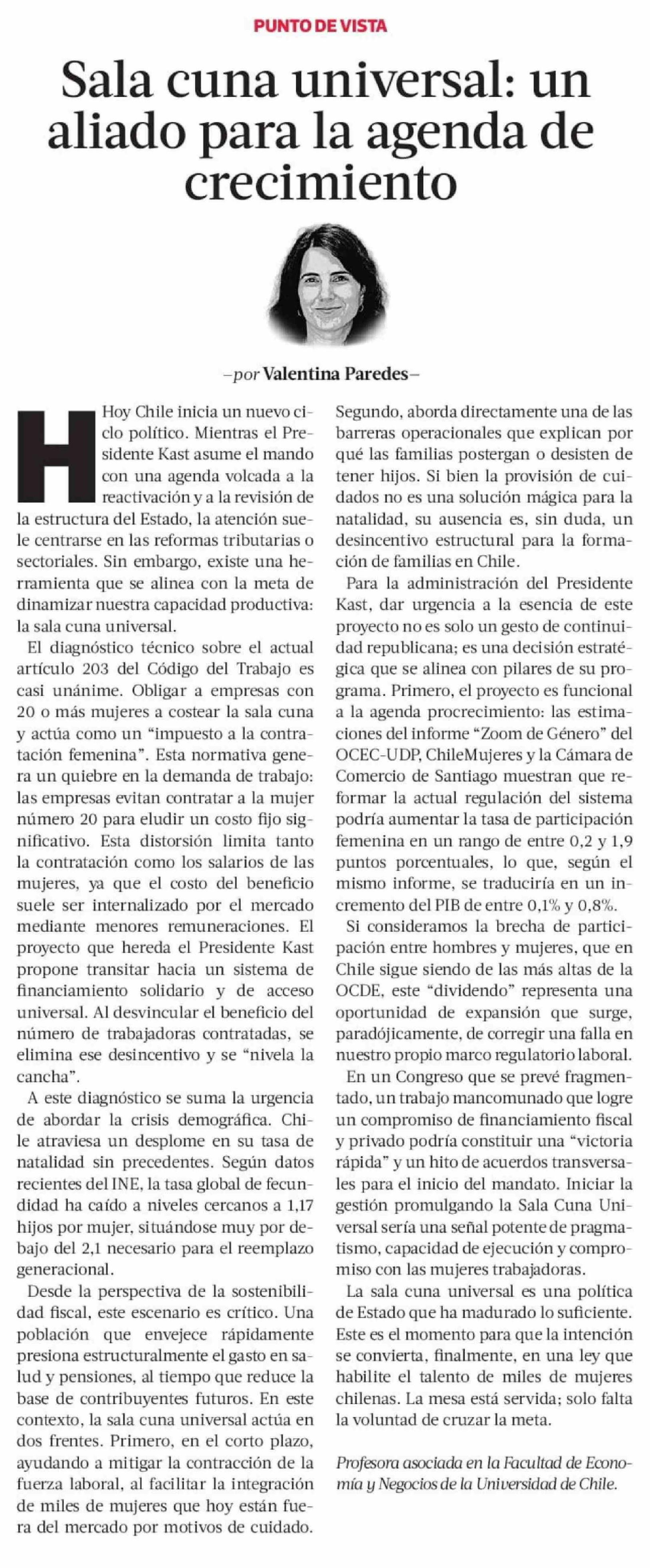 Columnas de Opinión: Sala cuna universal: un aliado para la agenda de crecimiento