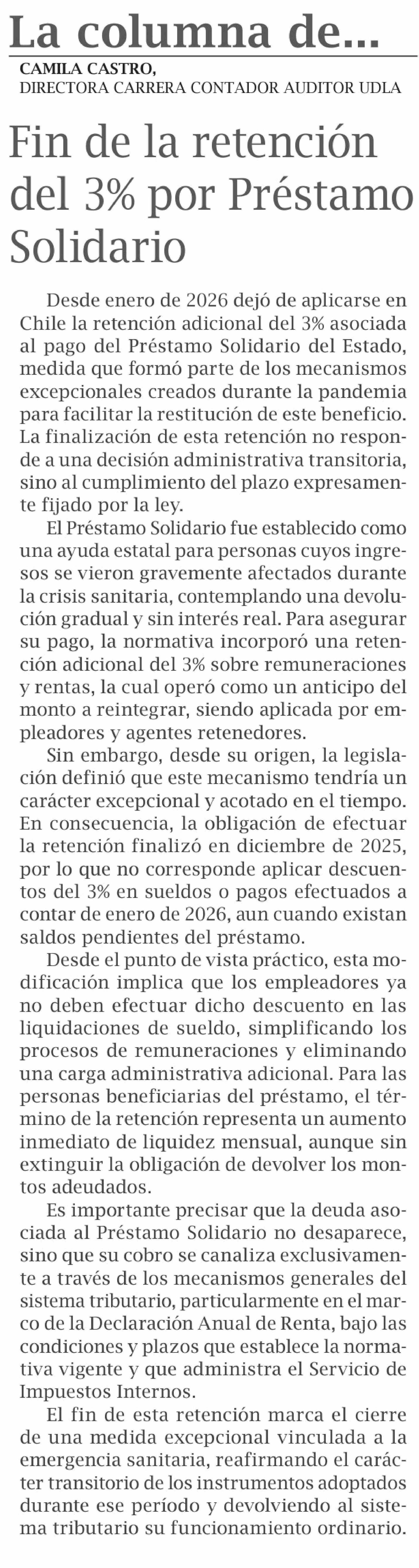 Columnas de Opinión: FIN DE LA RETENCIÓN DEL 3% POR PRESTAMO SOLIDARIO