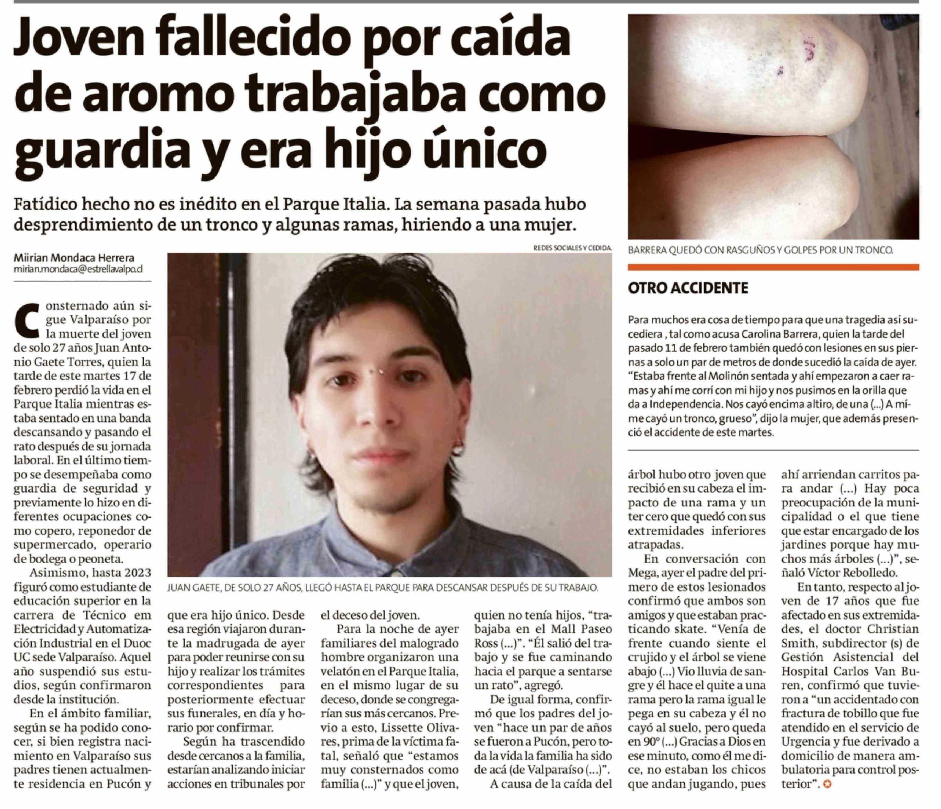 Título: Joven fallecido por caída de aromo trabajaba como guardia y era hijo único