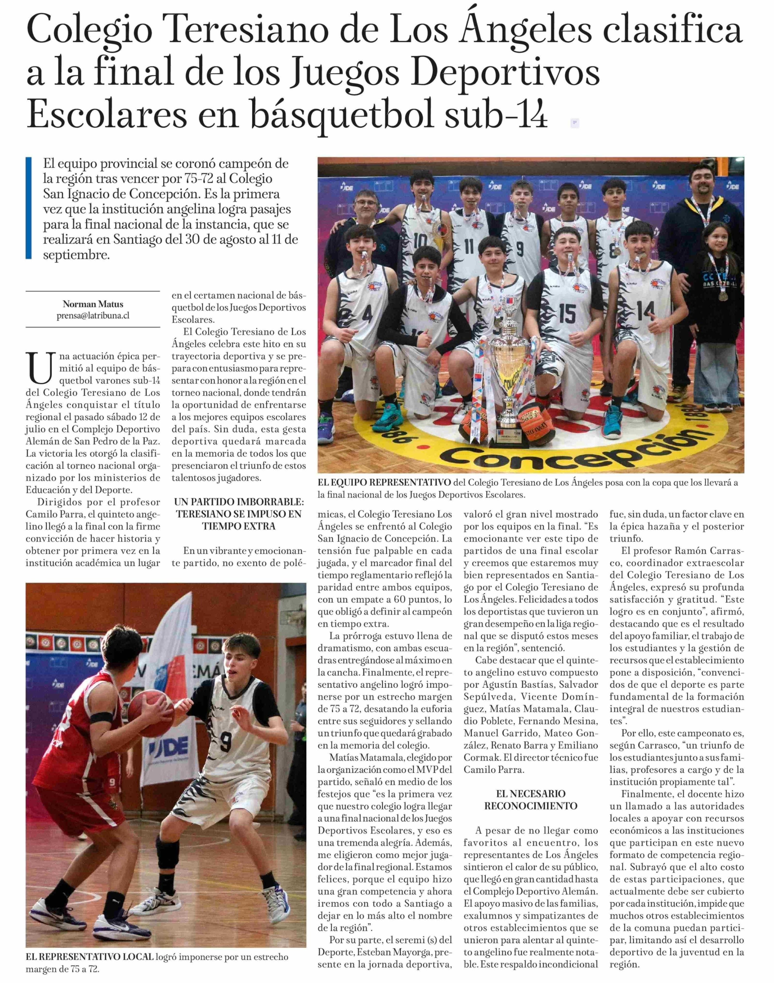 Colegio Teresiano de Los Angeles clasifica a la final de los Juegos Deportivos Escolares en básquetbol sub-14