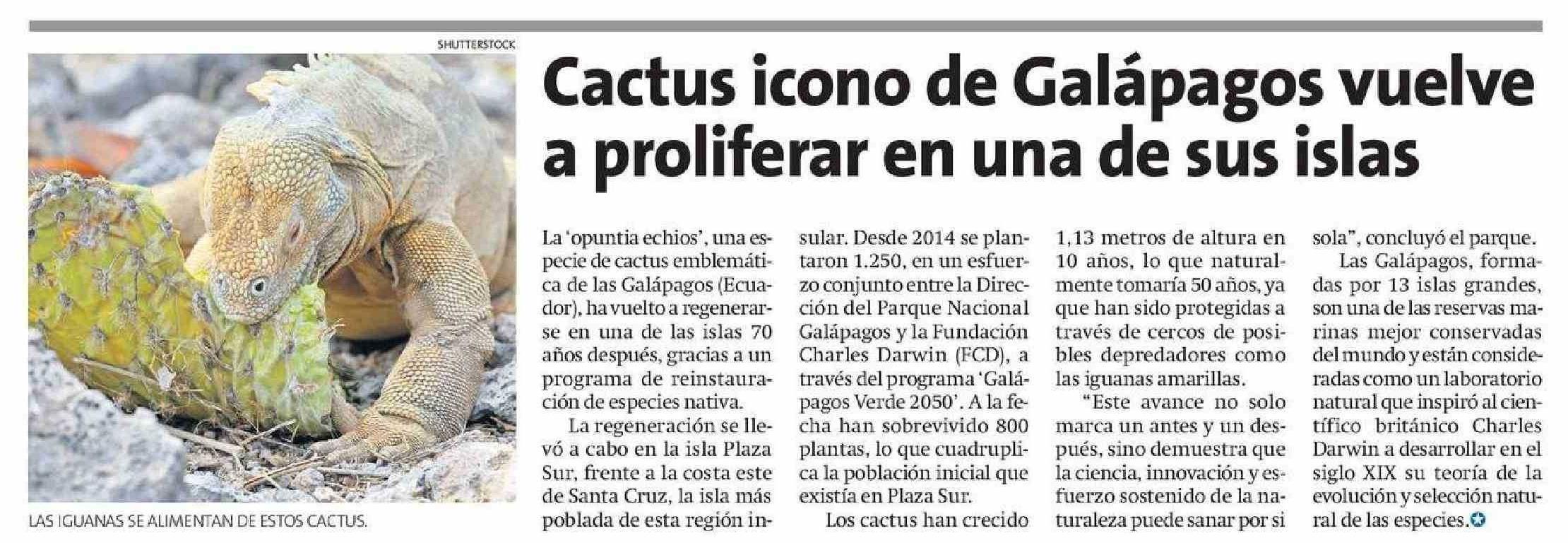 Cactus icono de Galápagos vuelve a proliferar en una de sus islas
