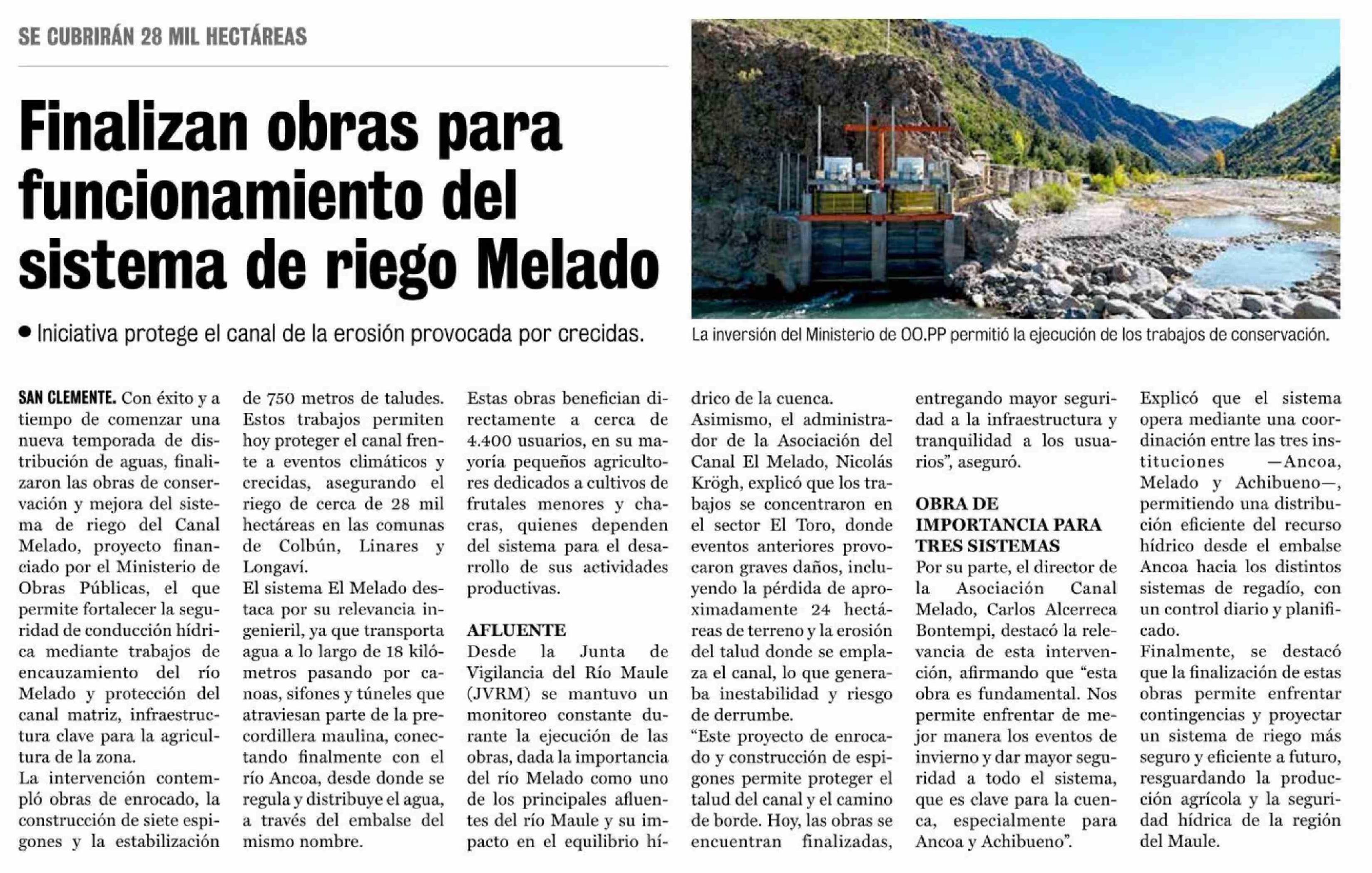 Finalizan obras para funcionamiento del sistema de riego Melado