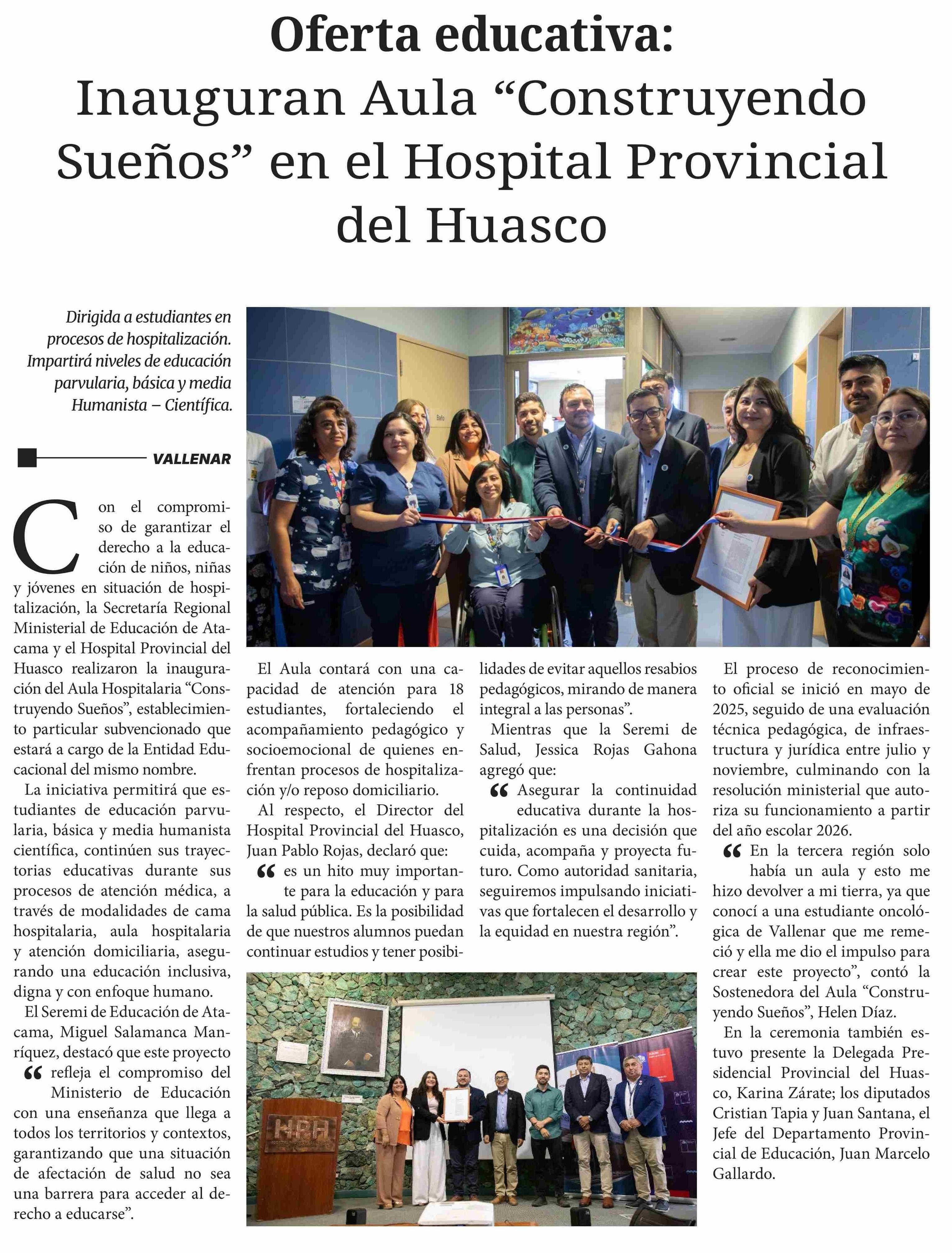 Título: Oferta educativa: Inauguran Aula "Construyendo Sueños" en el Hospital Provincial del Huasco