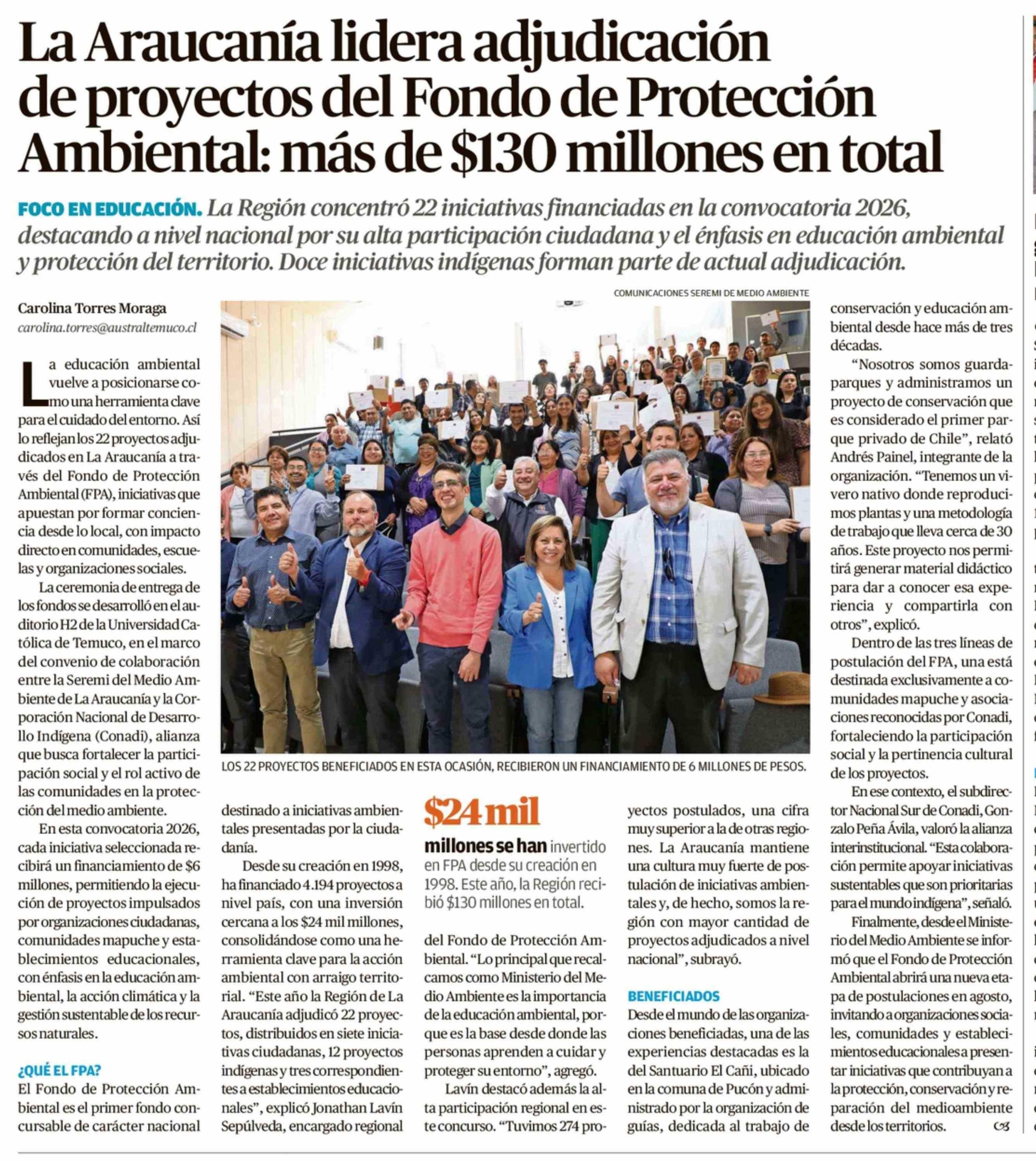 La Araucanía lidera adjudicación de proyectos del Fondo de Protección Ambiental: más de $130 millones en total