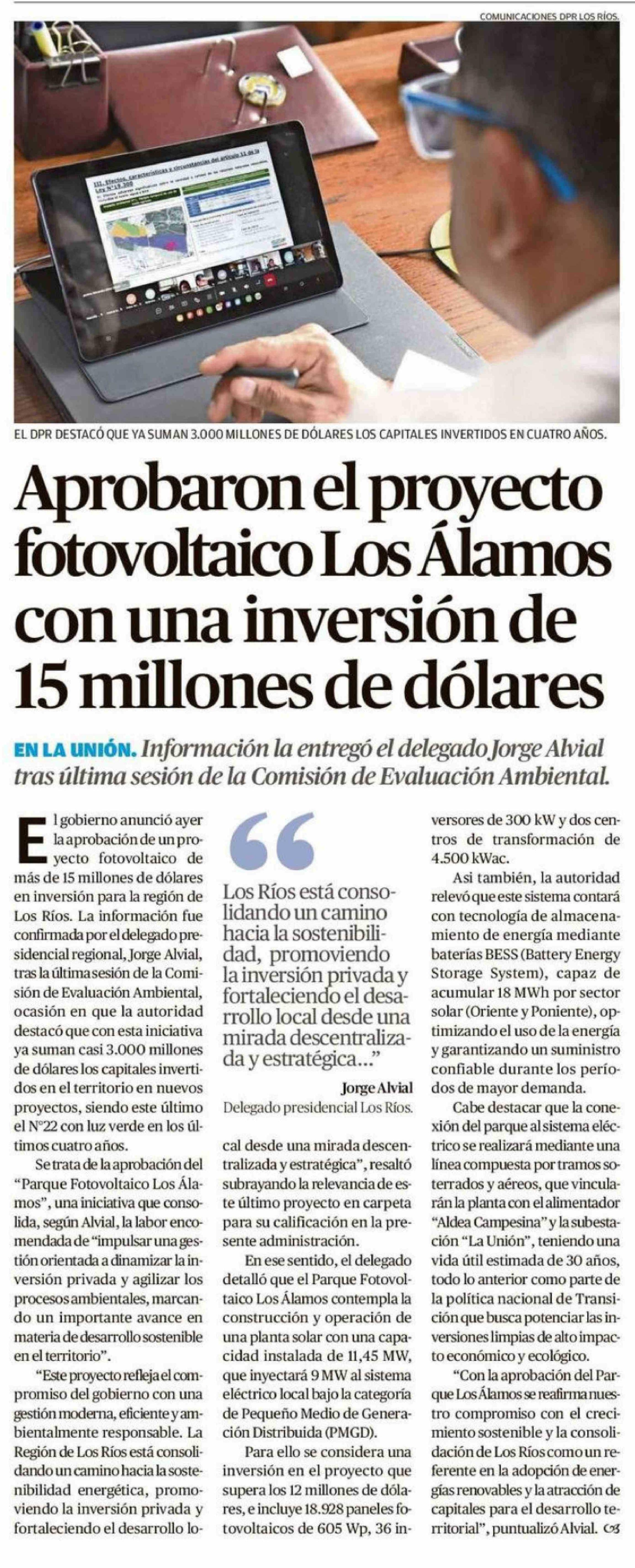 Aprobaron el proyecto fotovoltaico Los Álamos con una inversión de 15 millones de dólares
